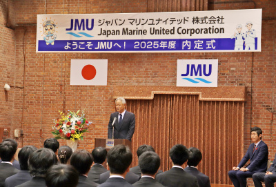 ジャパンマリンユナイテッド(JMU)は1日、2026年春の入社予定者を対象とした内定式を創業地の一つである京都府舞鶴市で開いた。廣瀬崇社長は内定式で、「世界の荷動き量は右肩上がりで増え続けており、地