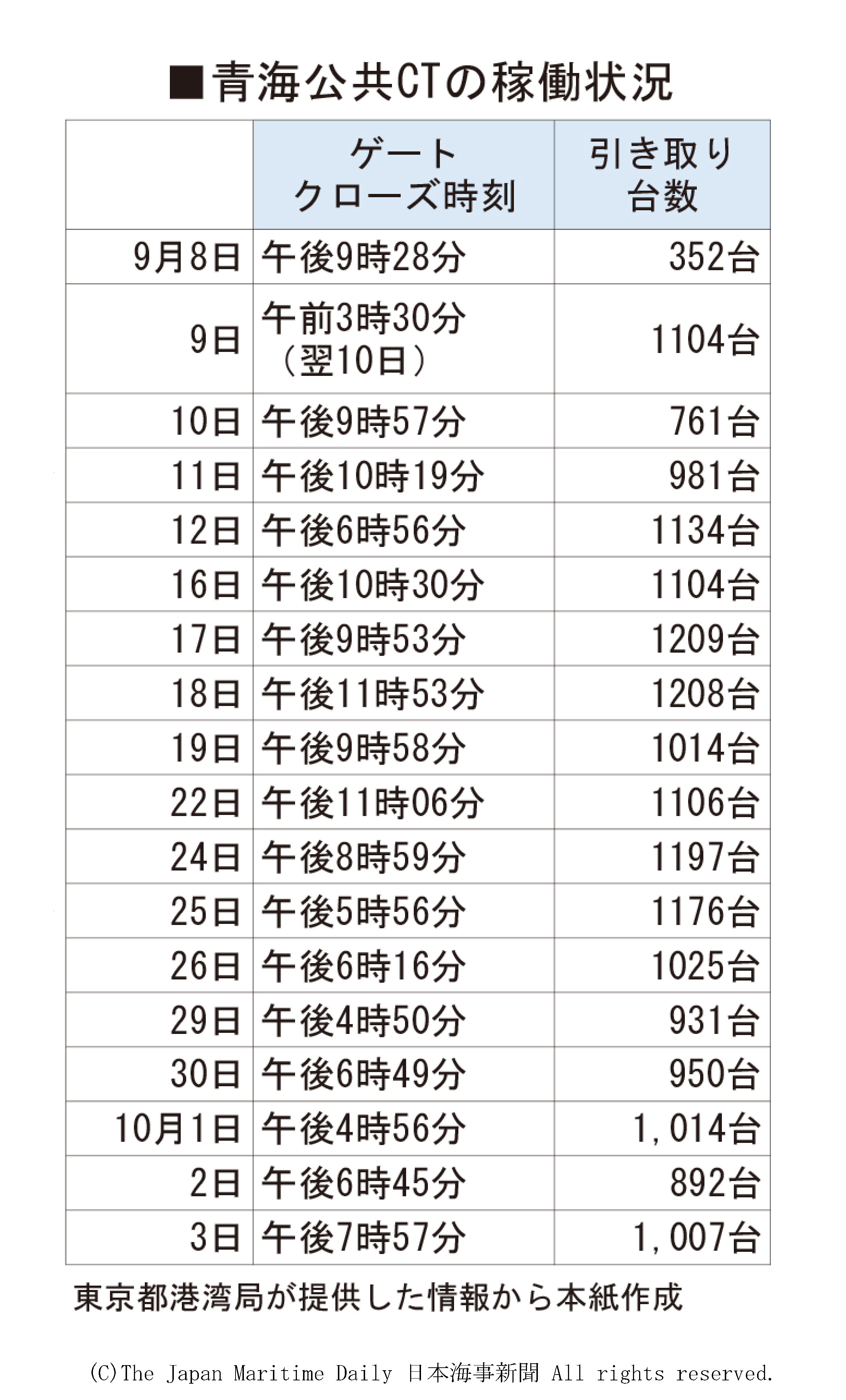 東京港の青海公共コンテナターミナル(CT)運営事業者によると、9月に同CTで発生したシステム障害を端緒とするゲート前混雑悪化は同月25日に収束した。障害発生は8日で、24日に復旧。最後の車両がゲート