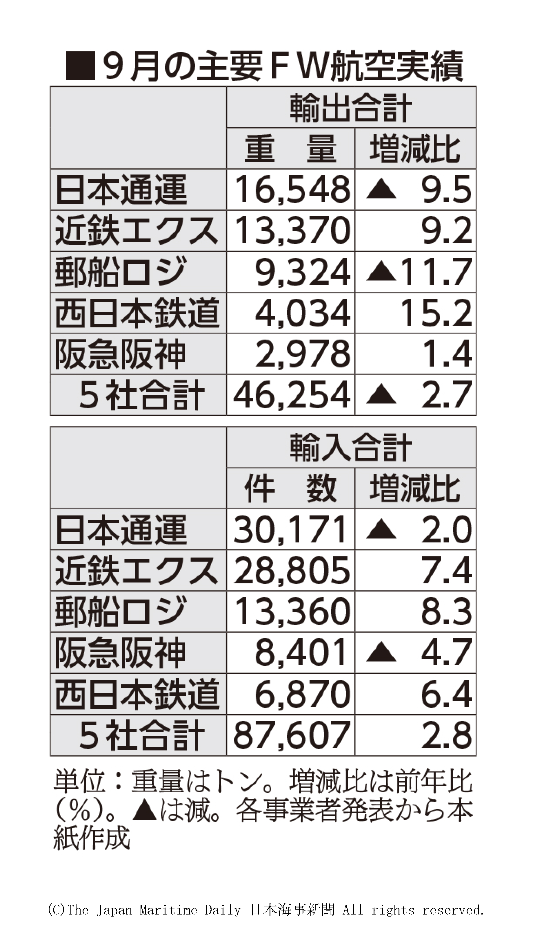 航空貨物フォワーダー(FW)主要5社(日本通運、近鉄エクスプレス、郵船ロジスティクス、西日本鉄道、阪急阪神エクスプレス)の9月の日本発輸出航空混載重量は、前年同月比3%減の4万6254トンだった。前