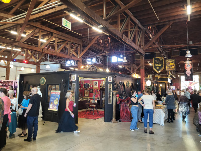 アートやアンティーク品が展示されたブースや郷土料理のブースを見て楽しむ参加者たち