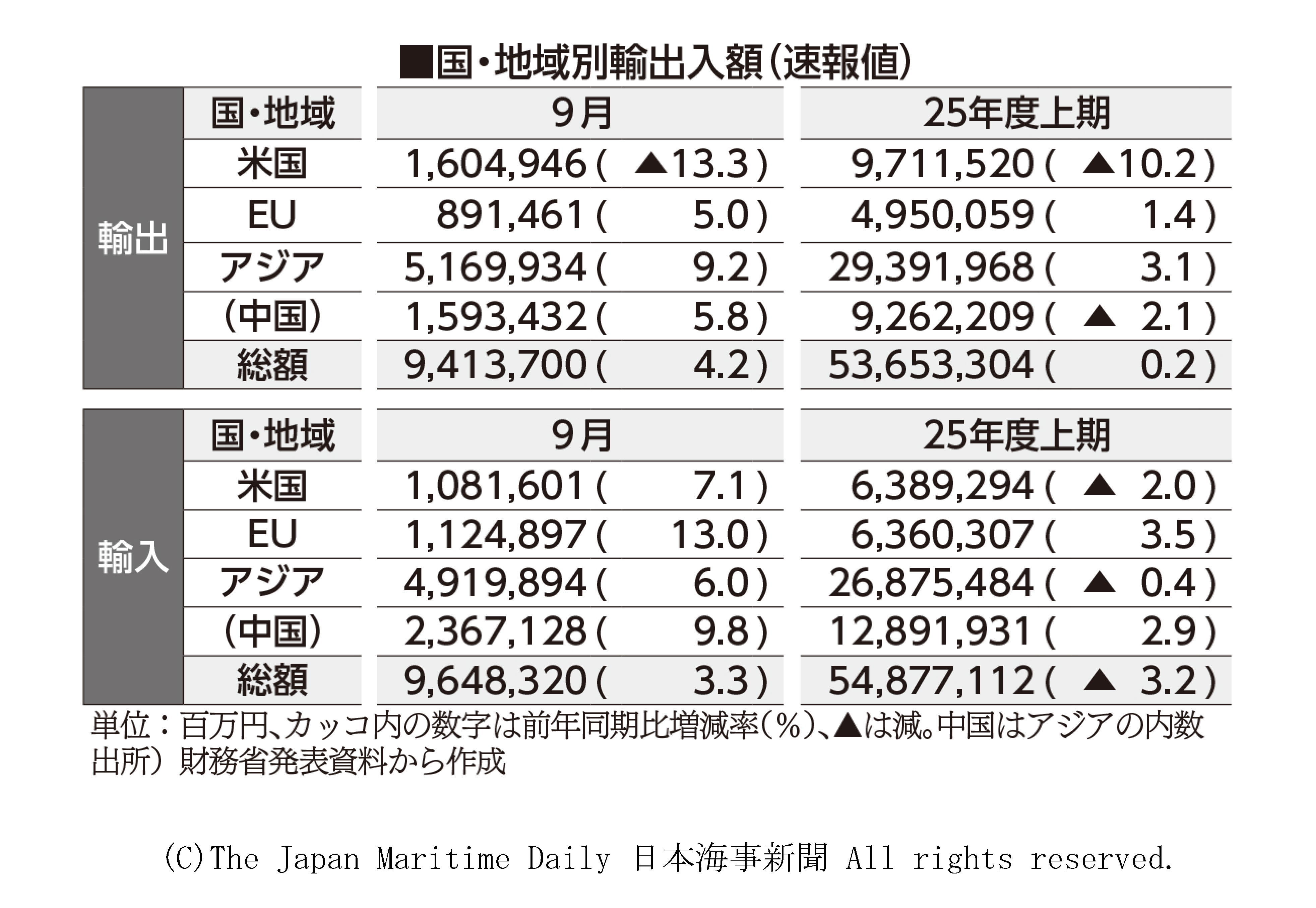 財務省の貿易統計(速報)によると、2025年度上半期(4―9月)の輸出額は前年同期比0・2%増の53兆6533億円だった。アジア向けなどの半導体等電子部品が増加したが、米国向けの自動車や部分品が減少 ・・・ %E3%80%80%E8%B2%A1%E5%8B%99%E7%9C%81%E3%81%AE%E8%B2%BF%E6%98%93%E7%B5%B1%E8%A8%88%28%E9%80%9F%E5%A0%B1%29%E3%81%AB%E3%82%88%E3%82%8B%E3%81%A8%E3%80%812025%E5%B9%B4%E5%BA%A6%E4%B8%8A%E5%8D%8A%E6%9C%9F%284%E2%80%959%E6%9C%88%29%E3%81%AE%E8%BC%B8%E5%87%BA%E9%A1%8D%E3%81%AF%E5%89%8D%E5%B9%B4%E5%90%8C%E6%9C%9F%E6%AF%940%E3%83%BB2%25%E5%A2%97%E3%81%AE53%E5%85%866533%E5%84%84%E5%86%86%E3%81%A0%E3%81%A3%E3%81%9F%E3%80%82%E3%82%A2%E3%82%B8%E3%82%A2%E5%90%91%E3%81%91%E3%81%AA%E3%81%A9%E3%81%AE%E5%8D%8A%E5%B0%8E%E4%BD%93%E7%AD%89%E9%9B%BB%E5%AD%90%E9%83%A8%E5%93%81%E3%81%8C%E5%A2%97%E5%8A%A0%E3%81%97%E3%81%9F%E3%81%8C%E3%80%81%E7%B1%B3%E5%9B%BD%E5%90%91%E3%81%91%E3%81%AE%E8%87%AA%E5%8B%95%E8%BB%8A%E3%82%84%E9%83%A8%E5%88%86%E5%93%81%E3%81%8C%E6%B8%9B%E5%B0%91%E3%81%97%E3%81%9F%E3%80%82%E7%B1%B3%E5%9B%BD%E5%90%91%E3%81%91%E3%81%AF%E5%8D%8A%E6%9C%9F%E3%83%99%E3%83%BC%E3%82%B9%E3%81%A79%E6%9C%9F%E3%81%B6%E3%82%8A%E3%81%AB%E6%B8%9B%E5%B0%91%E3%81%97%E3%80%81%E5%8D%98%E6%9C%88%E3%81%A7%E3%81%AF6%E3%82%AB%E6%9C%88%E9%80%A3%E7%B6%9A%E3%81%AE%E5%89%8D%E5%B9%B4%E5%89%B2%E3%82%8C%E3%81%A0%E3%81%A3%E3%81%9F%E3%80%82%E8%BC%B8%E5%85%A5%E9%A1%8D%E3%81%AF3%25%E6%B8%9B%E3%81%AE54%E5%85%868771%E5%84%84%E5%86%86%E3%81%A73%E6%9C%9F%E3%81%B6%E3%82%8A%E3%81%AE%E3%83%9E%E3%82%A4%E3%83%8A%E3%82%B9%E3%80%82%E8%B2%BF%E6%98%93%E5%8F%8E%E6%94%AF%E3%81%AF1%E5%85%862238%E5%84%84%E5%86%86%E3%81%AE%E8%B5%A4%E5%AD%97%E3%81%A8%E3%81%AA%E3%82%8A%E3%80%81%E8%B5%A4%E5%AD%97%E3%81%AF9%E6%9C%9F%E9%80%A3%E7%B6%9A%E3%81%A0%E3%81%A3%E3%81%9F%E3%80%82%3Cbr%3E%E3%80%80%E6%95%B0%E9%87%8F%E6%8C%87%E6%95%B0%E3%81%AF%E8%BC%B8%E5%87%BA%E3%81%8C%E5%89%8D%E5%B9%B4%E5%90%8C%E6%9C%9F%E4%B8%A6%E3%81%BF%E3%81%AE101%E3%83%BB8%E3%81%A0%E3%81%A3%E3%81%9F%E3%80%82%E8%BC%B8%E5%85%A5%E3%81%AF5%25%E5%A2%97%E3%81%AE100%E3%83%BB5%E3%81%A72%E6%9C%9F%E9%80%A3%E7%B6%9A%E3%81%AE%E5%A2%97%E5%8A%A0%E3%80%82%3Cbr%3E%E3%80%80%E5%9B%BD%E3%83%BB%E5%9C%B0%E5%9F%9F%E5%88%A5%E3%81%AE%E8%BC%B8%E5%87%BA%E9%A1%8D%E3%82%92%E8%A6%8B%E3%82%8B%E3%81%A8%E3%80%81%E7%B1%B3%E5%9B%BD%E5%90%91%E3%81%91%E3%81%AF10%25%E6%B8%9B%E3%81%AE9%E5%85%867115%E5%84%84%E5%86%86%E3%81%A0%E3%81%A3%E3%81%9F%E3%80%82%E8%87%AA%E5%8B%95%E8%BB%8A%E3%81%8C23%25%E6%B8%9B%E3%80%81%E5%8D%8A%E5%B0%8E%E4%BD%93%E7%AD%89%E8%A3%BD%E9%80%A0%E8%A3%85%E7%BD%AE%E3%81%8C33%25%E6%B8%9B%E3%80%81%E8%87%AA%E5%8B%95%E8%BB%8A%E3%81%AE%E9%83%A8%E5%88%86%E5%93%81%E3%81%8C12%25%E6%B8%9B%E3%81%AB%E8%90%BD%E3%81%A1%E8%BE%BC%E3%82%93%E3%81%A0%E3%80%82%E8%87%AA%E5%8B%95%E8%BB%8A%E3%81%AE%E8%BC%B8%E5%87%BA%E5%8F%B0%E6%95%B0%E3%81%AF2%25%E6%B8%9B%E3%81%AE66%E4%B8%872914%E5%8F%B0%E3%80%81%E8%87%AA%E5%8B%95%E8%BB%8A%E3%81%AE%E9%83%A8%E5%88%86%E5%93%81%E3%81%AE%E8%BC%B8%E5%87%BA%E9%87%8F%E3%81%AF5%25%E6%B8%9B%E3%81%AE26%E4%B8%873321%E3%83%88%E3%83%B3%E3%80%82%3Cbr%3E%E3%80%80EU%28%E6%AC%A7%E5%B7%9E%E9%80%A3%E5%90%88%29%E3%81%AF1%25%E5%A2%97%E3%81%AE4%E5%85%869501%E5%84%84%E5%86%86%E3%81%A83%E6%9C%9F%E3%81%B6%E3%82%8A%E3%81%AB%E3%83%97%E3%83%A9%E3%82%B9%E3%81%AB%E8%BB%A2%E3%81%98%E3%81%9F%E3%80%82%E5%BB%BA%E8%A8%AD%E7%94%A8%E3%83%BB%E9%89%B1%E5%B1%B1%E7%94%A8%E6%A9%9F%E6%A2%B0%E3%81%8C31%25%E5%A2%97%E3%80%81%E8%87%AA%E5%8B%95%E8%BB%8A%E3%81%8C3%25%E5%A2%97%E3%80%81%E5%8D%8A%E5%B0%8E%E4%BD%93%E7%AD%89%E9%9B%BB%E5%AD%90%E9%83%A8%E5%93%81%E3%81%8C21%25%E5%A2%97%E3%81%A0%E3%81%A3%E3%81%9F%E3%80%82%3Cbr%3E%E3%80%80%E3%82%A2%E3%82%B8%E3%82%A2%E3%81%AF3%25%E5%A2%97%E3%81%AE29%E5%85%863920%E5%84%84%E5%86%86%E3%81%A8%E3%81%AA%E3%82%8A%E3%80%814%E6%9C%9F%E9%80%A3%E7%B6%9A%E3%81%A7%E5%A2%97%E5%8A%A0%E3%81%97%E3%81%9F%E3%80%82%E5%8D%8A%E5%B0%8E%E4%BD%93%E7%AD%89%E9%9B%BB%E5%AD%90%E9%83%A8%E5%93%81%E3%81%8C5%25%E5%A2%97%E3%80%81%E5%8D%8A%E5%B0%8E%E4%BD%93%E7%AD%89%E8%A3%BD%E9%80%A0%E8%A3%85%E7%BD%AE%E3%81%8C3%25%E5%A2%97%E3%80%81%E3%83%9D%E3%83%B3%E3%83%97%E3%83%BB%E9%81%A0%E5%BF%83%E5%88%86%E9%9B%A2%E6%A9%9F%E3%81%8C15%25%E5%A2%97%E3%81%A8%E3%81%AA%E3%82%8A%E3%80%81%E5%AE%9F%E7%B8%BE%E3%82%92%E6%8A%BC%E3%81%97%E4%B8%8A%E3%81%92%E3%81%9F%E3%80%82%3Cbr%3E%E3%80%80%E3%81%9F%E3%81%A0%E3%81%97%E3%80%81%E4%B8%AD%E5%9B%BD%E5%90%91%E3%81%91%E3%81%AF2%25%E6%B8%9B%E3%81%AE9%E5%85%862622%E5%84%84%E5%86%86%E3%81%A74%E6%9C%9F%E3%81%B6%E3%82%8A%E3%81%AE%E3%83%9E%E3%82%A4%E3%83%8A%E3%82%B9%E3%80%82%E5%8D%8A%E5%B0%8E%E4%BD%93%E7%AD%89%E8%A3%BD%E9%80%A0%E8%A3%85%E7%BD%AE%E3%81%AE10%25%E6%B8%9B%E3%80%81%E9%9D%9E%E9%89%84%E9%87%91%E5%B1%9E%E3%81%AE19%25%E6%B8%9B%E3%80%81%E8%87%AA%E5%8B%95%E8%BB%8A%E3%81%AE9%25%E6%B8%9B%E3%81%AA%E3%81%A9%E3%81%8C%E9%9F%BF%E3%81%84%E3%81%9F%E3%80%82%3Cbr%3E%E3%80%80%E5%9B%BD%E3%83%BB%E5%9C%B0%E5%9F%9F%E5%88%A5%E3%81%AE%E8%BC%B8%E5%85%A5%E9%A1%8D%E3%81%A7%E3%81%AF%E3%80%81%E7%B1%B3%E5%9B%BD%E5%87%BA%E3%81%97%E3%81%AF2%25%E6%B8%9B%E3%81%AE6%E5%85%863893%E5%84%84%E5%86%86%E3%81%A0%E3%81%A3%E3%81%9F%E3%80%82%E5%91%A8%E8%BE%BA%E6%A9%9F%E5%99%A8%E5%90%AB%E3%82%80%E9%9B%BB%E7%AE%97%E6%A9%9F%E9%A1%9E%E3%80%81%E6%B6%B2%E5%8C%96%E5%A4%A9%E7%84%B6%E3%82%AC%E3%82%B9%E3%81%AA%E3%81%A9%E3%81%8C%E6%B8%9B%E5%B0%91%E3%81%97%E3%81%9F%E3%80%82%E3%82%A2%E3%82%B8%E3%82%A2%E3%81%AF0%E3%83%BB4%25%E6%B8%9B%E3%81%AE26%E5%85%868755%E5%84%84%E5%86%86%E3%81%A73%E6%9C%9F%E3%81%B6%E3%82%8A%E3%81%AE%E3%83%9E%E3%82%A4%E3%83%8A%E3%82%B9%E3%80%82%E3%82%A8%E3%83%8D%E3%83%AB%E3%82%AE%E3%83%BC%E9%96%A2%E9%80%A3%E3%81%AE%E8%BC%B8%E5%85%A5%E6%B8%9B%E3%81%8C%E4%B8%8B%E6%8A%BC%E3%81%97%E3%81%97%E3%81%9F%E3%80%82%3Cbr%3E%E3%80%80%E3%81%93%E3%82%8C%E3%81%AB%E5%AF%BE%E3%81%97%E3%81%A6%E3%80%81%E4%B8%AD%E5%9B%BD%E5%87%BA%E3%81%97%E3%81%AF%E5%91%A8%E8%BE%BA%E6%A9%9F%E5%99%A8%E5%90%AB%E3%82%80%E9%9B%BB%E7%AE%97%E6%A9%9F%E9%A1%9E%E3%80%81%E9%80%9A%E4%BF%A1%E6%A9%9F%E3%80%81%E9%83%A8%E5%93%81%E5%90%AB%E3%82%80%E9%9F%B3%E9%9F%BF%E6%98%A0%E5%83%8F%E6%A9%9F%E5%99%A8%E3%81%AA%E3%81%A9%E3%81%8C%E5%A5%BD%E8%AA%BF%E3%81%A73%25