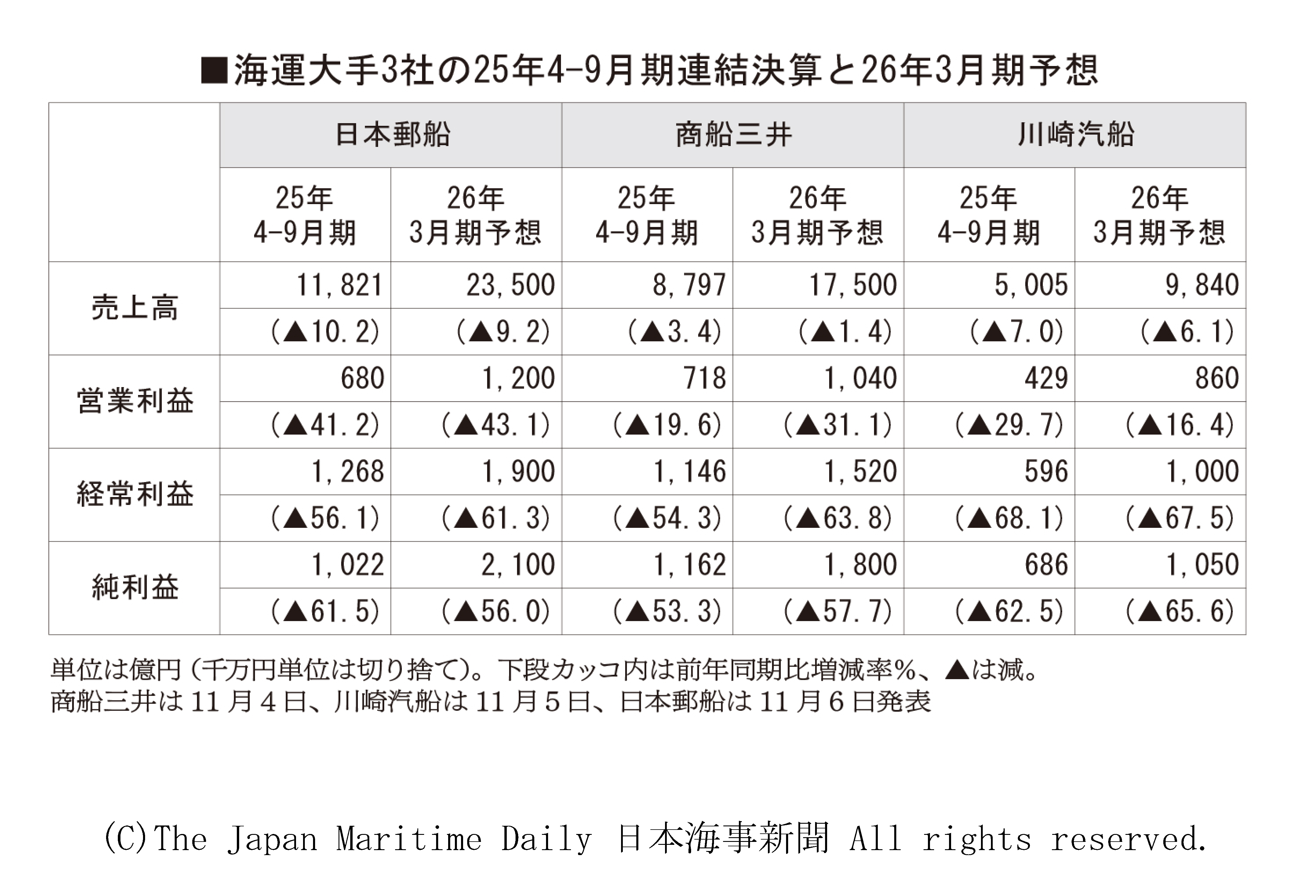 %E3%80%80%3Cb%3E%E6%97%A5%E6%9C%AC%E9%83%B5%E8%88%B9%3C%2Fb%3E%E3%81%AF6%E6%97%A5%E3%80%812026%E5%B9%B43%E6%9C%88%E6%9C%9F%E9%80%9A%E6%9C%9F%E3%81%AE%E9%80%A3%E7%B5%90%E6%A5%AD%E7%B8%BE%E4%BA%88%E6%83%B3%E3%81%AE%E4%BF%AE%E6%AD%A3%E3%82%92%E7%99%BA%E8%A1%A8%E3%81%97%E3%81%9F%E3%80%82%E7%B5%8C%E5%B8%B8%E5%88%A9%E7%9B%8A%E3%81%AF%E5%89%8D%E5%9B%9E%E7%99%BA%E8%A1%A8%E3%81%8B%E3%82%89500%E5%84%84%E5%86%86%E6%B8%9B%E3%81%AE1900%E5%84%84%E5%86%86%28%E5%89%8D%E6%9C%9F%E6%AF%9461%25%E6%B8%9B%29%E3%80%81%E7%B1%B3%E5%9B%BD%E3%81%AE%E9%96%A2%E7%A8%8E%E6%94%BF%E7%AD%96%E3%82%84%E3%80%81%3Cdiv+class%3D%27kiji_relation%27%3E%3Cb%3E%E6%96%B0%3C%2Fb%3E%3Cb%3E%E9%80%A0%3C%2Fb%3E%3Cdiv+class%3Drel_link%3E%3Ca+href%3D%27%2Fnewsec%2F%27+target%3D%27_blank%27%3E%E6%96%B0%E9%80%A0%E3%83%BB%E4%B8%AD%E5%8F%A4%E8%88%B9Fixture%E6%83%85%E5%A0%B1%3C%2Fa%3E%3C%2Fdiv%3E%3C%2Fdiv%3E%E8%88%B9%E7%AB%A3%E5%B7%A5%E3%81%AB%E3%82%88%E3%82%8B%E8%88%B9%E8%85%B9%E4%BE%9B%E7%B5%A6%E9%87%8F%E3%81%AE%E5%A2%97%E5%8A%A0%E3%81%AB%E3%82%88%E3%82%8A%E3%80%81%E5%AE%9A%E6%9C%9F%E8%88%B9%E4%BA%8B%E6%A5%AD%E3%81%A7%E3%81%AE%E9%81%8B%E8%B3%83%E6%B0%B4%E6%BA%96%E3%81%8C%E5%89%8D%E5%9B%9E%E6%83%B3%E5%AE%9A%E3%82%92%E4%B8%8B%E5%9B%9E%E3%82%8B%E3%81%BB%E3%81%8B%E3%80%81%E8%87%AA%E5%8B%95%E8%BB%8A%E4%BA%8B%E6%A5%AD%E3%81%A7%E3%82%82%E7%B1%B3%E5%9B%BD%E3%81%AE%E6%96%B0%E5%85%A5%E6%B8%AF%E6%96%99%E3%81%8C%E5%88%A9%E7%9B%8A%E3%81%AE%E6%8A%BC%E3%81%97%E4%B8%8B%E3%81%92%E8%A6%81%E5%9B%A0%E3%81%A8%E3%81%AA%E3%82%8B%E8%A6%8B%E9%80%9A%E3%81%97%E3%80%82%E5%96%B6%E6%A5%AD%E5%88%A9%E7%9B%8A%E3%81%AF%E5%90%8C200%E5%84%84%E5%86%86%E4%B8%8B%E6%96%B9%E4%BF%AE%E6%AD%A3%E3%81%AE1200%E5%84%84%E5%86%86%2843%25%E6%B8%9B%29%E3%80%81%E5%BD%93%E6%9C%9F%E7%B4%94%E5%88%A9%E7%9B%8A%E3%81%8C300%E5%84%84%E5%86%86%E4%B8%8B%E6%96%B9%E4%BF%AE%E6%AD%A3%E3%81%AE2100%E5%84%84%E5%86%86%2856%25%E6%B8%9B%29%E3%80%82%E5%A3%B2%E4%B8%8A%E9%AB%98%E3%81%AF2%E5%85%863500%E5%84%84%E5%86%86%289%25%E6%B8%9B%29%E3%81%A7%E5%A4%89%E6%9B%B4%E7%84%A1%E3%81%97%E3%80%82%3Cbr%3E%3Cbr%3E%E3%80%80%E2%96%A0%E5%85%A5%E6%B8%AF%E6%96%99%E3%80%81%E8%87%AA%E5%8B%95%E8%BB%8A%E3%81%A770%E5%84%84%E5%86%86%3Cbr%3E%E3%80%80%E9%83%B5%E8%88%B9%E3%81%AE%E7%99%BA%E8%A1%A8%E3%81%AB%E3%82%88%E3%82%8A%E3%80%81%E6%B5%B7%E9%81%8B%E5%A4%A7%E6%89%8B3%E7%A4%BE%E3%81%AE4%E2%80%959%E6%9C%88%E6%9C%9F%E6%A5%AD%E7%B8%BE%E3%81%A826%E5%B9%B43%E6%9C%88%E6%9C%9F%E9%80%9A%E6%9C%9F%E6%A5%AD%E7%B8%BE%E4%BA%88%E6%83%B3%E3%81%8C%E5%87%BA%E3%81%9D%E3%82%8D%E3%81%A3%E3%81%9F%28%E8%A1%A8%E5%8F%82%E7%85%A7%29%E3%80%82%E9%80%9A%E6%9C%9F%E4%BA%88%E6%83%B3%E3%81%AF3%E7%A4%BE%E3%81%A8%E3%82%82%E6%B8%9B%E5%8F%8E%E6%B8%9B%E7%9B%8A%E3%80%82%3Cdiv+class%3D%27kiji_relation%27%3E%3Cb%3E%E3%82%B3%3C%2Fb%3E%3Cb%3E%E3%83%B3%3C%2Fb%3E%3Cb%3E%E3%83%86%3C%2Fb%3E%3Cb%3E%E3%83%8A%3C%2Fb%3E%3Cb%3E%E8%88%B9%3C%2Fb%3E%3Cdiv+class%3Drel_link%3E%3Ca+href%3D%27%2Fstatic%2Fja%2Fcontainer%2FcontainerNational.html%27+target%3D%27_blank%27%3E%E5%9B%BD%E5%86%85%E6%B8%AF%E3%81%AE%E5%A4%96%E8%B3%87%E3%82%B3%E3%83%B3%E3%83%86%E3%83%8A%E5%8F%96%E6%89%B1%E9%87%8F%3C%2Fa%3E%3Ca+href%3D%27%2Fdrewrym%2F%3Fgcat%3D2%27+target%3D%27_blank%27%3EDrewry+Monthly%EF%BC%88%E3%82%B3%E3%83%B3%E3%83%86%E3%83%8A%E8%88%B9%EF%BC%89%3C%2Fa%3E%3C%2Fdiv%3E%3C%2Fdiv%3E%E9%81%8B%E8%B3%83%E3%81%AE%E4%B8%8B%E8%90%BD%E3%81%AA%E3%81%A9%E3%82%92%E5%8F%97%E3%81%91%E3%80%81%E4%BB%8A%E5%9B%9E%E3%81%AE%E7%99%BA%E8%A1%A8%E3%81%A7%E3%81%AF%E5%85%A8%E7%A4%BE%E3%81%8C%E5%88%A9%E7%9B%8A%E8%A6%8B%E9%80%9A%E3%81%97%E3%82%92%E4%B8%8B%E6%96%B9%E4%BF%AE%E6%AD%A3%E3%81%97%E3%81%9F%E3%80%82%3Cbr%3E%E3%80%80%E9%83%B5%E8%88%B9%E3%81%AF%E5%90%8C%E6%97%A5%E3%80%81%E3%82%AA%E3%83%B3%E3%83%A9%E3%82%A4%E3%83%B3%E4%BC%9A%E8%A6%8B%E3%82%92%E9%96%8B%E5%82%AC%E3%80%82%E6%9B%BD%E6%88%91%E8%B2%B4%E4%B9%9F%E7%A4%BE%E9%95%B7%E3%81%AF%E3%80%8C%E7%B1%B3%E4%B8%AD%E9%A6%96%E8%84%B3%E4%BC%9A%E8%AB%87%E4%BB%A5%E9%99%8D%E3%81%AE%E3%81%95%E3%81%BE%E3%81%96%E3%81%BE%E3%81%AA%E5%8B%95%E3%81%8D%E3%81%AF%E4%BB%8A%E5%9B%9E%E3%81%AE%E7%99%BA%E8%A1%A8%E3%81%AB%E3%81%AF%E7%B9%94%E3%82%8A%E8%BE%BC%E3%82%93%E3%81%A7%E3%81%84%E3%81%AA%E3%81%84%E3%80%82%28%E7%B1%B3%E4%B8%AD%E5%85%A5%E6%B8%AF%E6%96%99%E5%95%8F%E9%A1%8C%E3%80%81%E5%9C%B0%E6%94%BF%E5%AD%A6%E3%83%AA%E3%82%B9%E3%82%AF%E3%81%A8%29%E5%85%88%E8%A1%8C%E3%81%8D%E3%81%8C%E6%B7%B7%E6%B2%8C%E3%81%A8%E3%81%97%E3%81%9F%E4%B8%AD%E3%81%A7%E3%82%82%E3%80%81%28%E3%82%B3%E3%83%B3%E3%83%86%E3%83%8A%E8%88%B9%E4%BA%8B%E6%A5%AD%E4%BC%9A%E7%A4%BE%29ONE%28%E3%82%AA%E3%83%BC%E3%82%B7%E3%83%A3%E3%83%B3%E3%83%8D%E3%83%83%E3%83%88%E3%83%AF%E3%83%BC%E3%82%AF%E3%82%A8%E3%82%AF%E3%82%B9%E3%83%97%E3%83%AC%E3%82%B9%29%E4%BB%A5%E5%A4%96%E3%81%AE3%E4%BA%8B%E6%A5%AD%E9%83%A8%E9%96%80%28%E8%87%AA%E5%8B%95%E8%BB%8A%E3%80%81%E3%83%89%E3%83%A9%E3%82%A4%E3%83%90%E3%83%AB%E3%82%AF%E3%80%81%E3%82%A8%E3%83%8D%E3%83%AB%E3%82%AE%E3%83%BC%29%E3%81%AE%E5%AE%9F%E5%8A%9B%E3%82%92%E5%A0%85%E6%8C%81%E3%81%97%E3%81%A6%E3%81%84%E3%81%8F%E3%81%A8%E3%81%84%E3%81%86%E6%96%B9%E5%90%91%E6%80%A7%E3%81%AB%E5%A4%89%E5%8C%96%E3%81%AF%E3%81%AA%E3%81%84%E3%80%8D%E3%81%A8%E8%AA%9E%E3%81%A3%E3%81%9F%E3%80%82%3Cbr%3E%E3%80%80%E8%88%AA%E6%B5%B7%E6%83%85%E5%8B%A2%E3%81%AB%E8%B5%B7%E5%9B%A0%E3%81%99%E3%82%8B%E5%96%9C%E6%9C%9B%E5%B3%B0%E7%B5%8C%E7%94%B1%E3%81%8C%E7%B6%99%E7%B6%9A%E3%81%99%E3%82%8B%E3%81%93%E3%81%A8%E3%82%92%E6%83%B3%E5%AE%9A%E3%80%82%E7%82%BA%E6%9B%BF%E5%89%8D%E6%8F%90%E3%81%AF%E4%B8%8B%E6%9C%9F%2810%E6%9C%88%E2%80%9526%E5%B9%B43%E6%9C%88%29%E3%81%8C1%E3%83%89%E3%83%AB%3D147%E5%86%86%E3%80%82%E9%80%9A%E6%9C%9F%E3%81%8C146%E3%83%BB59%E5%86%86%E3%81%A7%E3%80%81%E5%89%8D%E6%9C%9F%E3%81%8B%E3%82%896%E3%83%BB14%E5%86%86%E3%81%AE%E5%86%86%E9%AB%98%E3%82%92%E8%A6%8B%E8%BE%BC%E3%82%80%E3%80%82%3Cbr%3E%E3%80%80USTR%28%E7%B1%B3%E9%80%9A%E5%95%86%E4%BB%A3%E8%A1%A8%E9%83%A8%29%E3%81%8C10%E6%9C%88%E5%B0%8E%E5%85%A5%E3%81%97%E3%81%9F%E5%85%A5%E6%B8%AF%E6%96%99%E3%81%AB%E3%81%A4%E3%81%84%E3%81%A6%E3%81%AF%E3%80%81%E8%87%AA%E5%8B%95%E8%BB%8A%E8%88%B9%E3%81%A7%E7%B4%8470%E5%84%84%E5%86%86%E3%81%AE%E6%B8%9B%E7%9B%8A%E8%A6%81%E5%9B%A0%E3%81%A8%E3%81%AA%E3%82