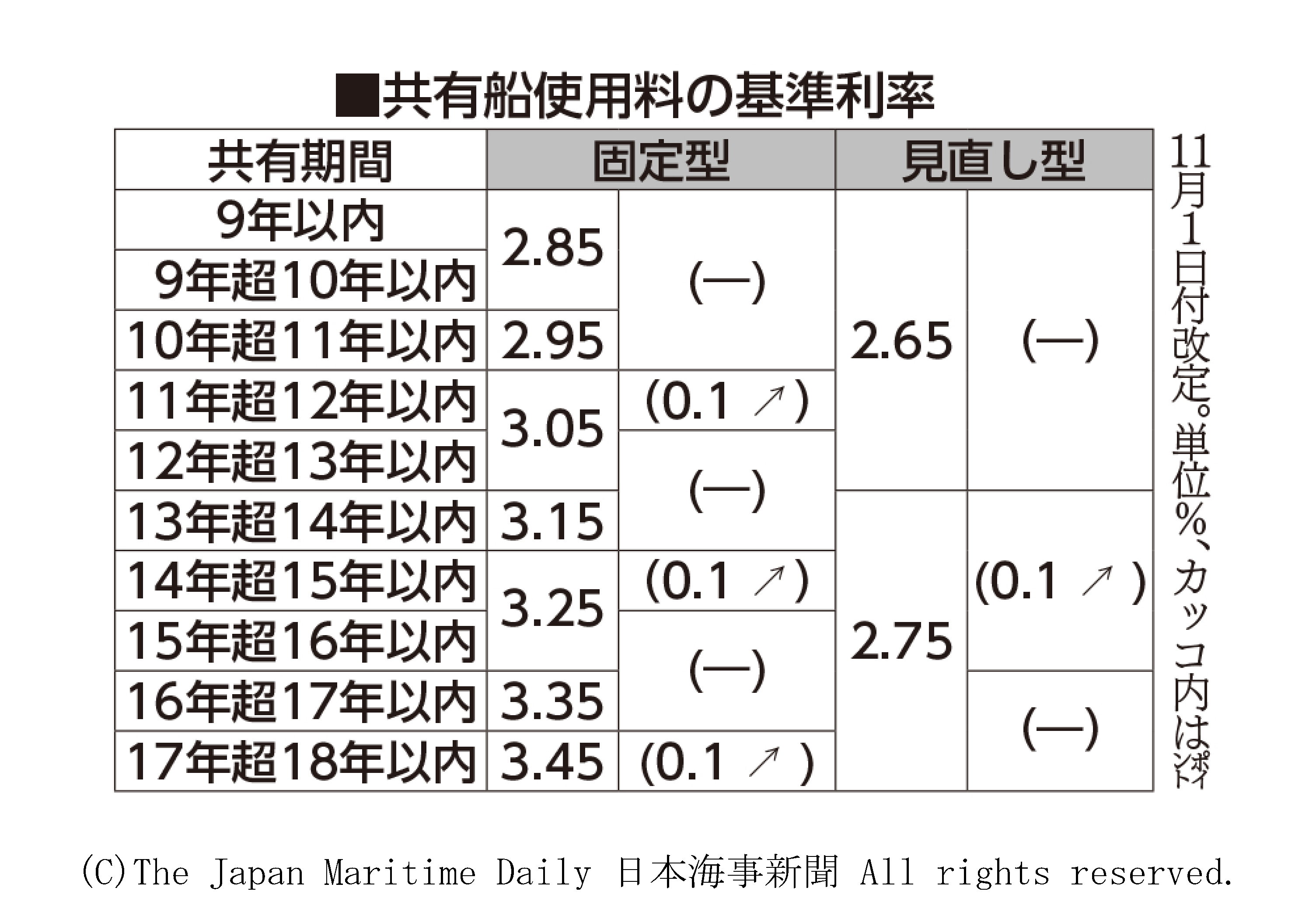 鉄道建設・運輸施設整備支援機構(JRTT)は1日付で、船舶共有建造制度の共有船の使用料に関する基準利率を改定した。「固定型」「5年ごと見直し型」ともに前月比で横ばいや0・1ポイントアップとなった。