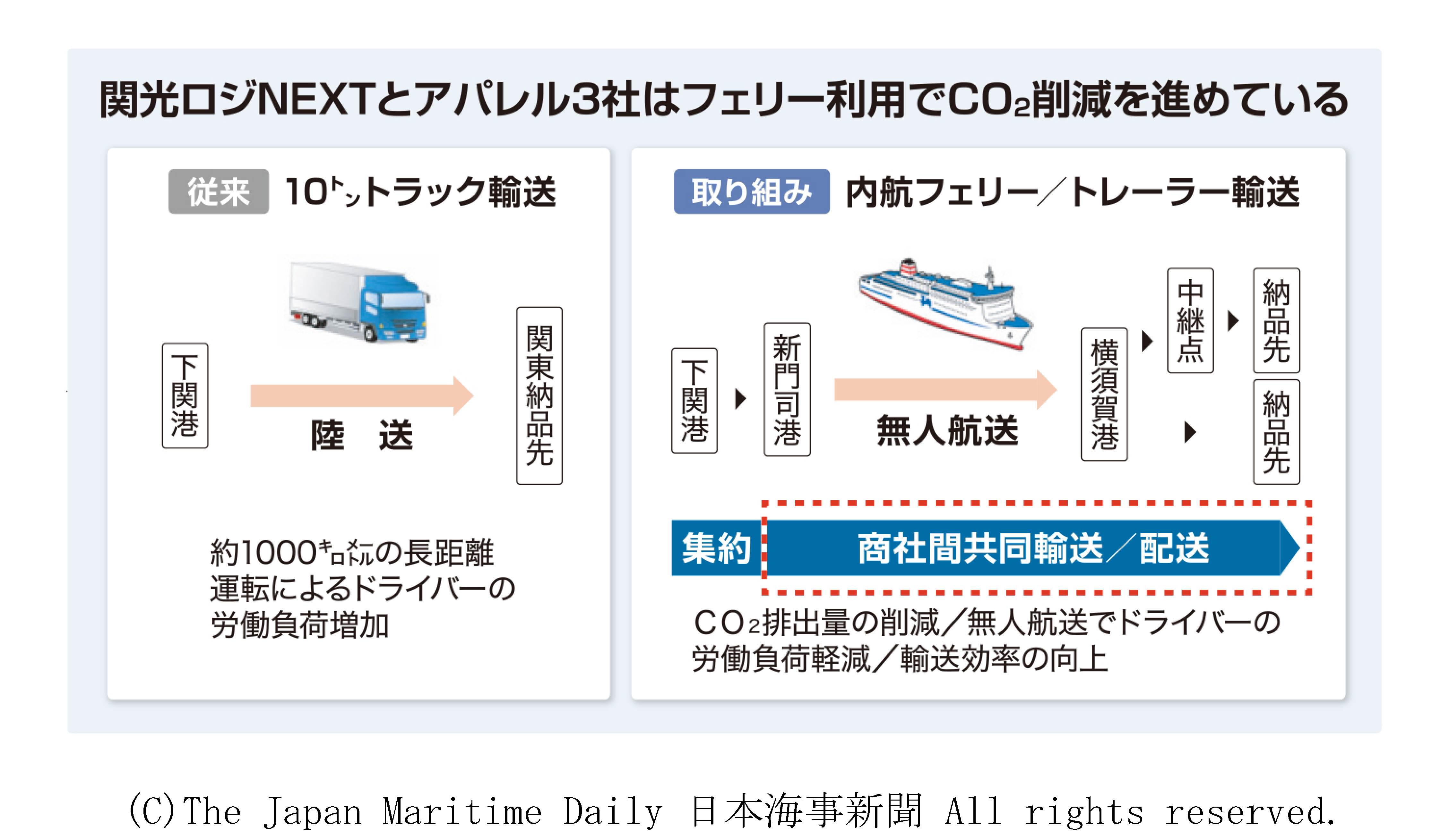 【関西】関光ロジNEXT(山口県下関市、入谷一成社長)は18日、豊島(名古屋市)、MNインターファッション(東京都)、ヤギ(大阪市)各社と連携し、同グループの国内フェリーを利用した共同輸送を3月から