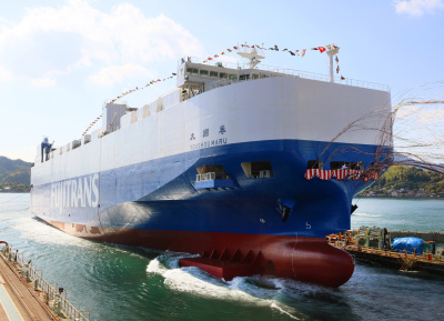 【中部】フジトランスコーポレーション(名古屋市)は21日、内海造船因島工場(広島県尾道市)で内航RORO船「蓉翔丸」の命名・進水式を行った。現在運航している「蓉翔丸」の代替船で、CO2(二酸化炭素)