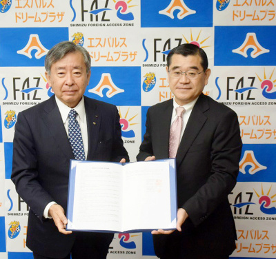 協定書を手にする塚本秀綱・静岡県副知事(右)と髙橋明彦・清水港模型聖地の会代表