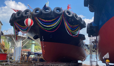 ■小門造船 4400馬力型タグボート「三笠」 小門造船(本社・山口県下関市、松浦寛社長)は11月21日、新日本海洋社向けの4400馬力型タグボート「三笠」=写真=の進水式を行った。同船は2026年4