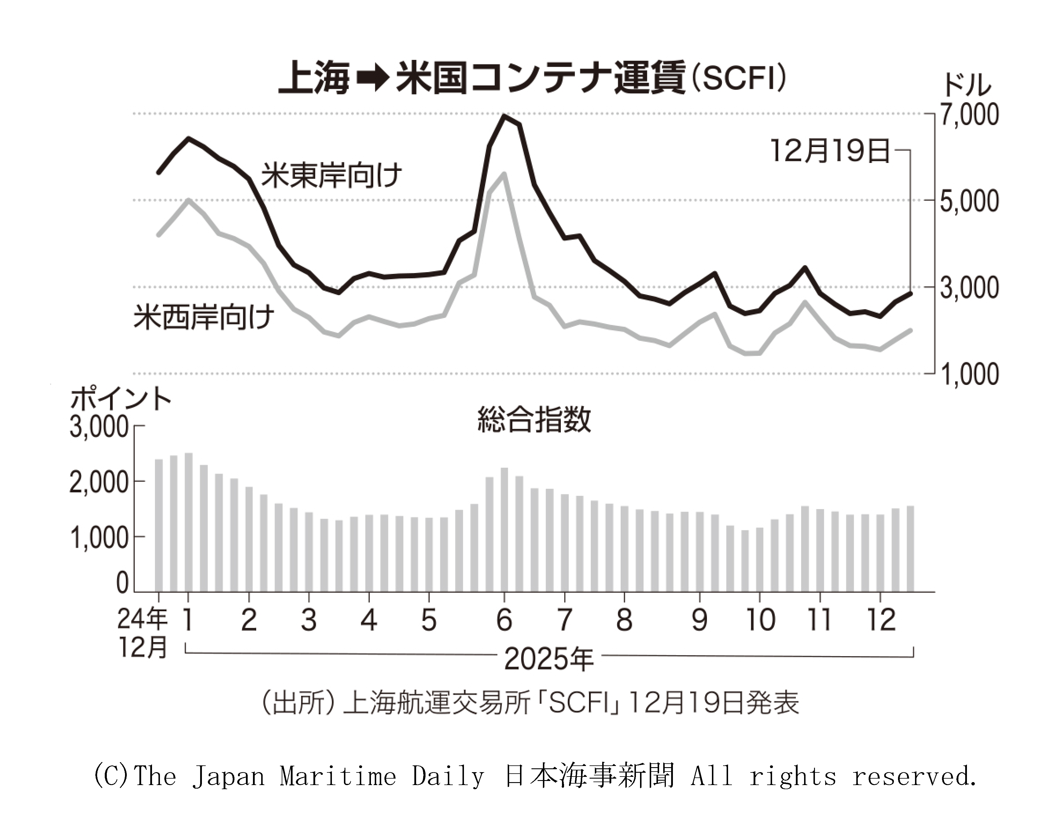 上海航運交易所(SSE)がまとめた19日付の上海発コンテナ運賃指数(SCFI)は、総合指数が2週連続で上昇した。北米西岸向けが前週からさらに1割超上昇して2000ドルに迫ったほか、東岸向けも続伸した