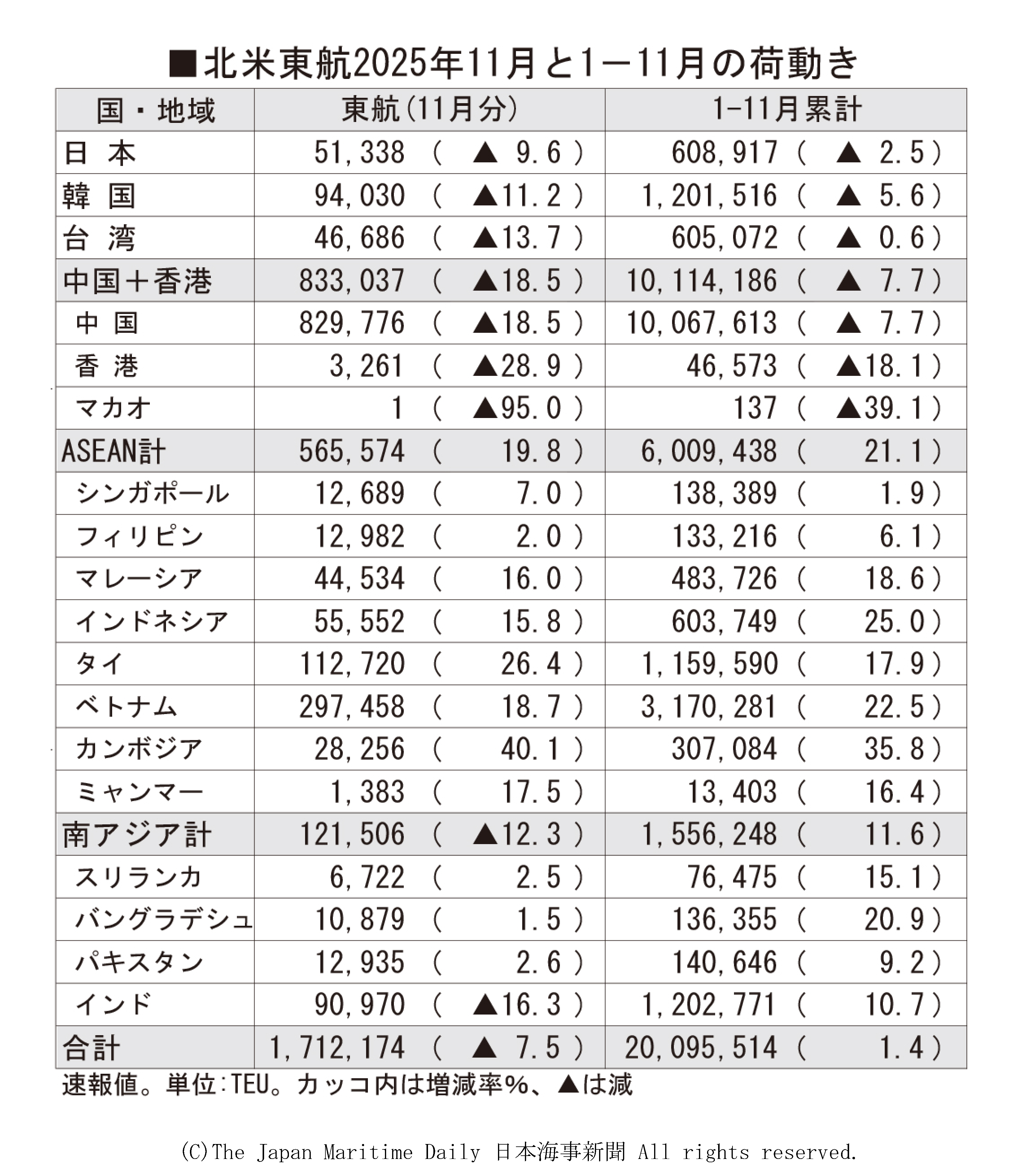 北米東航、11月8%減171万TEU。3カ月連続マイナス、中国発2割減響く