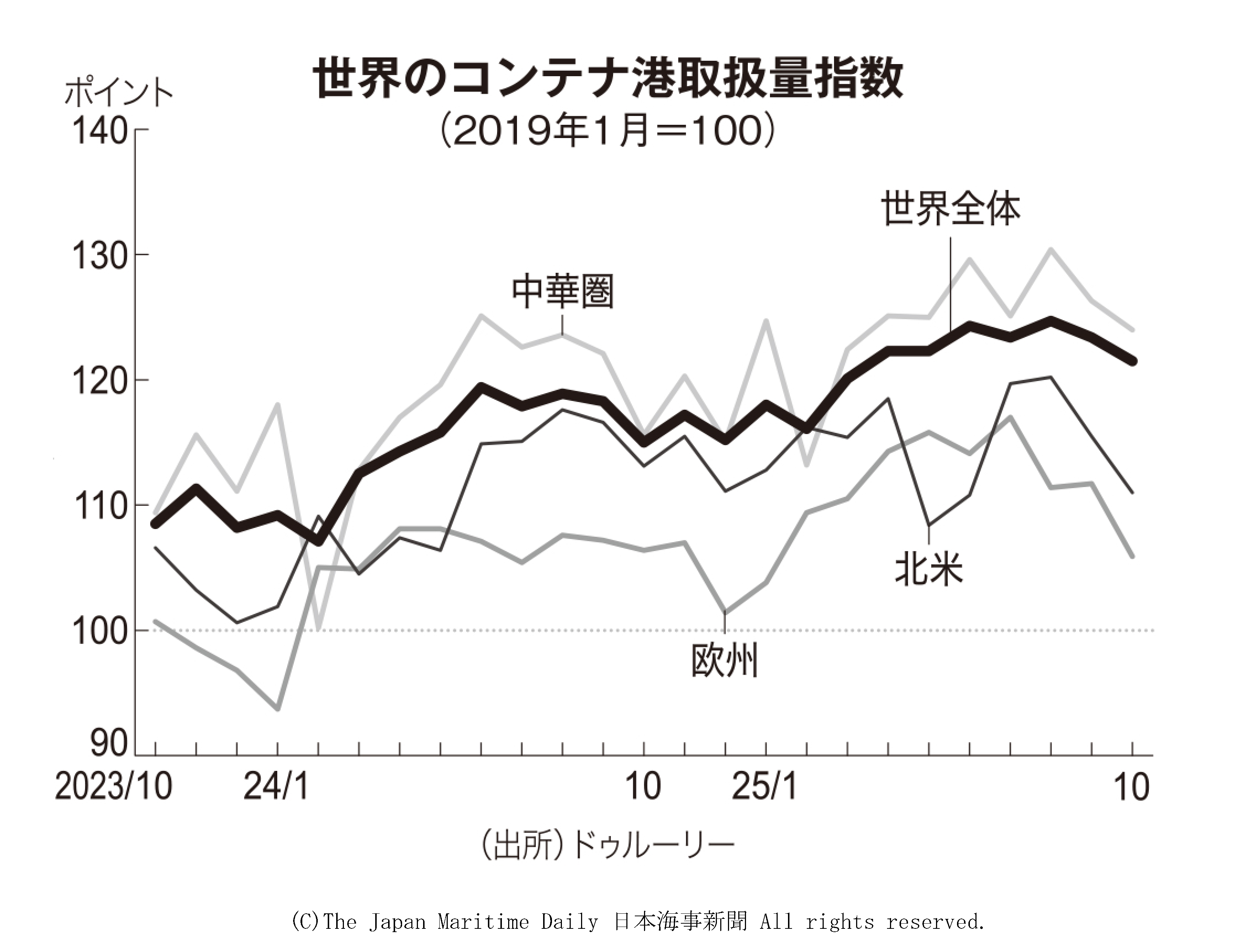 英調査会社ドゥルーリーがまとめた世界のコンテナ港取扱量指数は、昨年10月に121・5ポイントとなり、前年同月比で6%伸びて増加基調を維持した。前月比では2%減も高水準の推移が続く。米国の追加関税発動