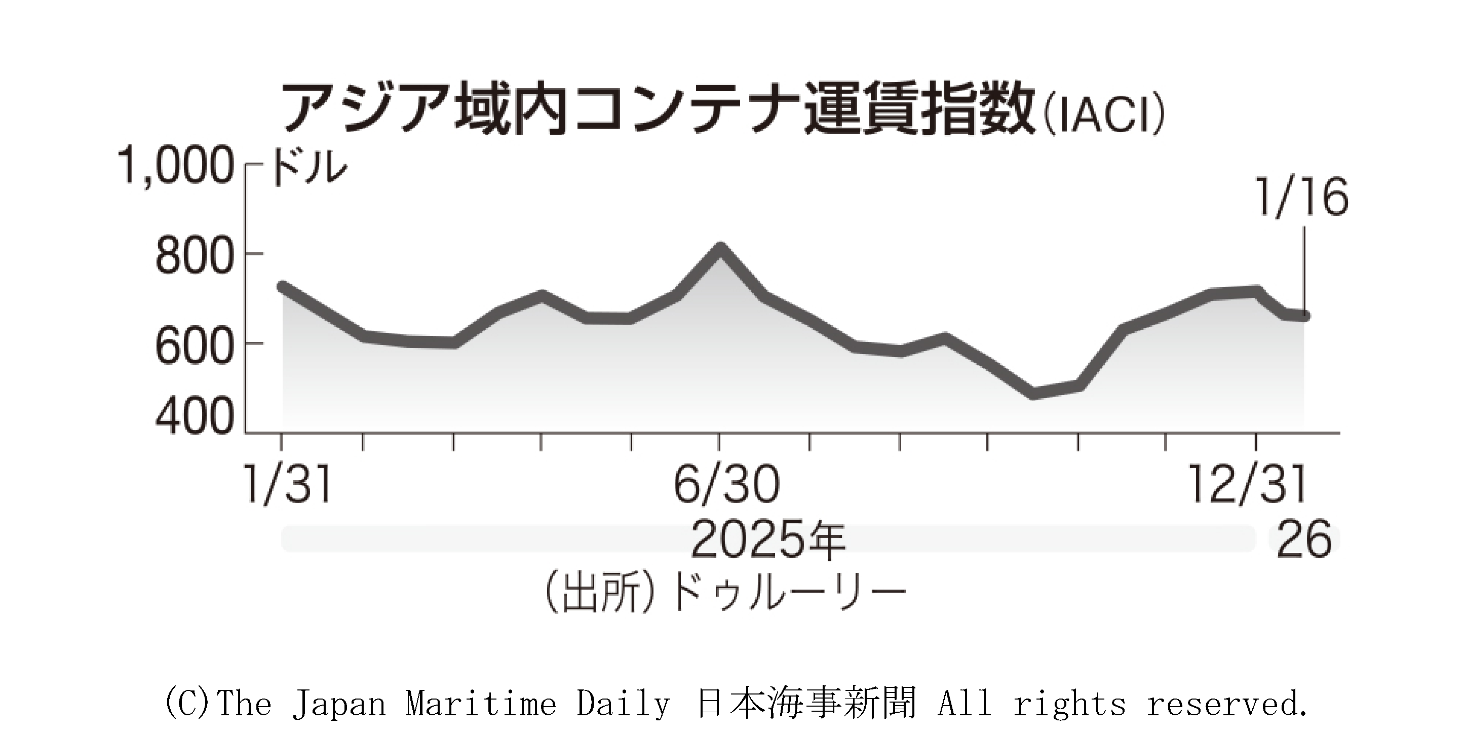 海事調査会社ドゥルーリーが16日付でまとめたアジア域内コンテナ運賃指数(IACI)は、40フィートコンテナ(FEU)当たり661ドルとなり、前週の665ドルから1%下落した。全体としては下落も、東南