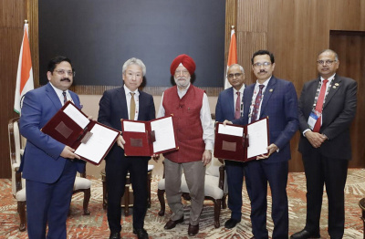 調印式に参加するプリ石油・天然ガス相(左から3人目)、金森氏(同2人目)、グプタ氏(右端)、ワドワ氏(左端)