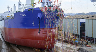■尾道造船 40型バルカー「AYSEL」 尾道造船は2月20日、尾道造船所(広島県尾道市)で建造中の4万重量トン型(40型)バルカー「AYSEL」(第842番船)=写真=の進水式を行った。同船は最適