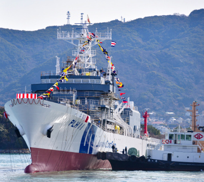 三菱重工業下関造船所(山口県下関市)で5日、海上保安庁初となる国際業務を主要な業務とする巡視船「ふじ」(6000総トン)が進水した。同船は外国の海上保安機関とのさらなる連携強化や海上保安官の育成など