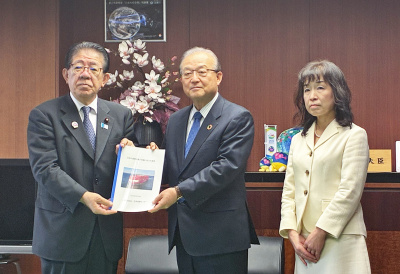 日本海事センターの宿利正史会長と、同センターの海事産業委員会委員長を務める早稲田大学法学学術院の河野真理子教授は11日、同委が取りまとめた「日本の海事産業の再興に向けた提言」を金子恭之国土交通相に手