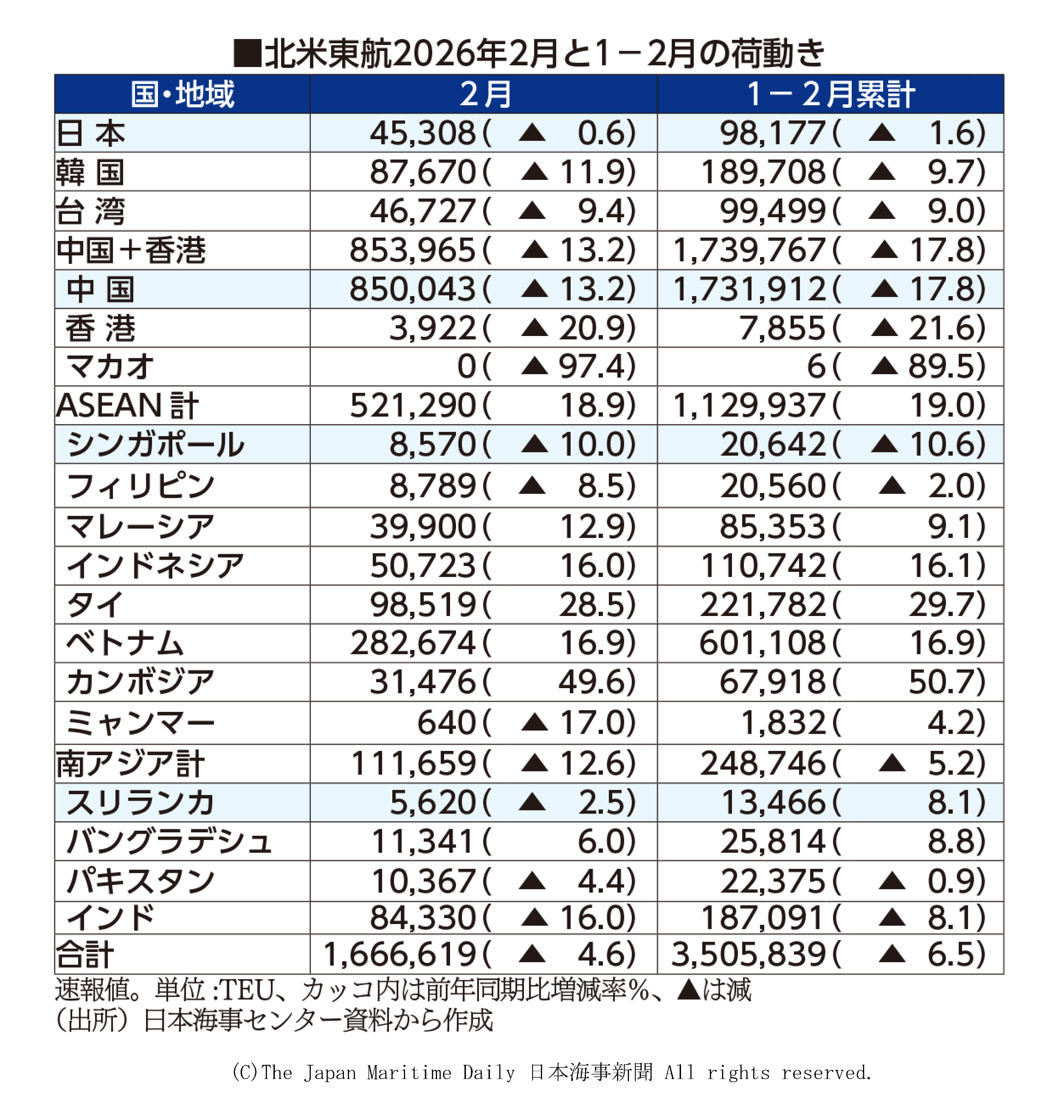 日本海事センターがまとめた2月のアジア18カ国・地域発米国向け往航(北米東航)コンテナ輸送量(速報値)は、前年同月比5%減の166・7万TEUで6カ月連続の前年割れだった。ASEAN(東南アジア諸国