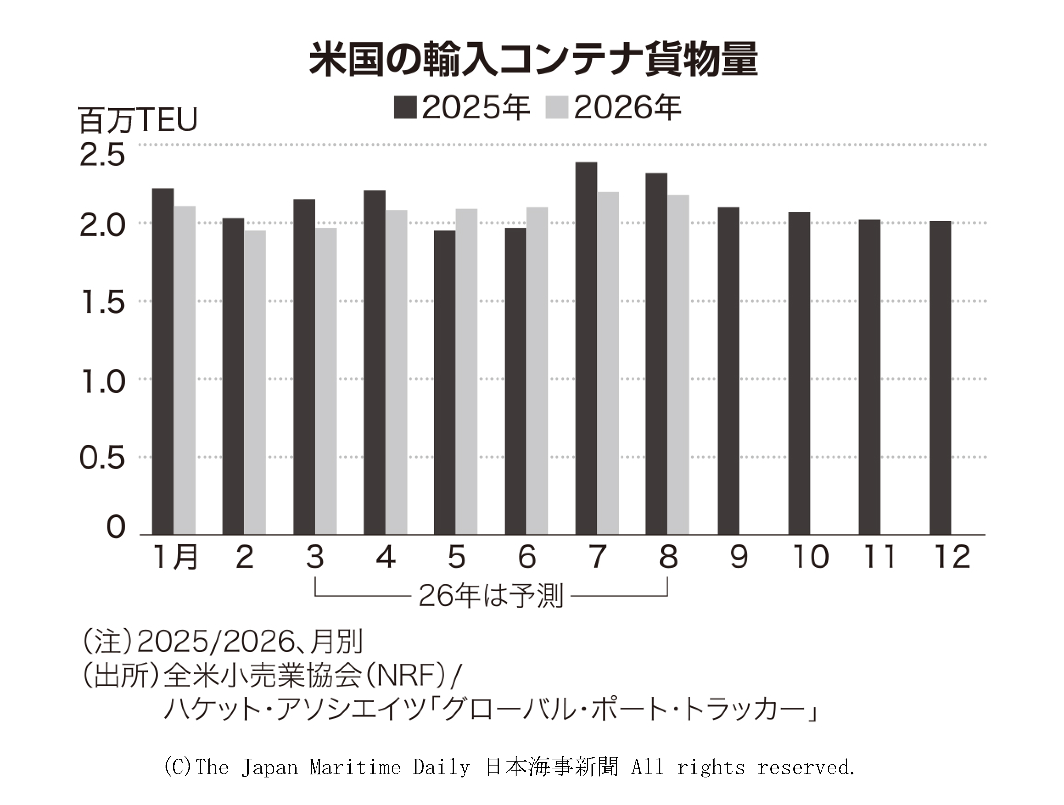 全米小売業協会(NRF)とハケット・アソシエイツが8日発表した「グローバル・ポート・トラッカー(GPT)」によると、米主要港湾の小売業向け輸入コンテナ取扱量は2026年上半期(1―6月)に前年同期比