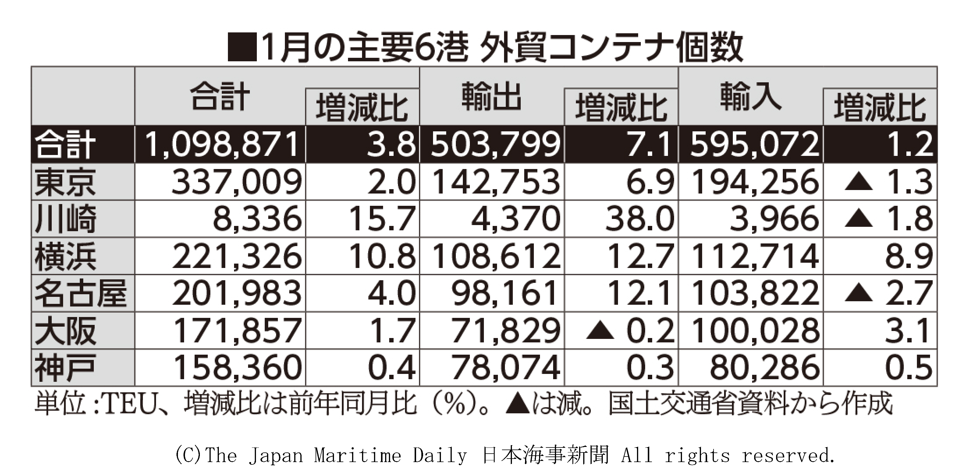 %E3%80%80%E5%9B%BD%E5%9C%9F%E4%BA%A4%E9%80%9A%E7%9C%81%E3%81%AE%E6%B8%AF%E6%B9%BE%E7%B5%B1%E8%A8%88%E9%80%9F%E5%A0%B1%E3%81%AB%E3%82%88%E3%82%8B%E3%81%A8%E3%80%811%E6%9C%88%E3%81%AE%E5%9B%BD%E5%86%85%E4%B8%BB%E8%A6%816%E6%B8%AF%28%E6%9D%B1%E4%BA%AC%E3%80%81%E5%B7%9D%E5%B4%8E%E3%80%81%E6%A8%AA%E6%B5%9C%E3%80%81%E5%90%8D%E5%8F%A4%E5%B1%8B%E3%80%81%E5%A4%A7%E9%98%AA%E3%80%81%E7%A5%9E%E6%88%B8%29%E3%81%AE%E5%A4%96%E8%B2%BF%3Cdiv+class%3D%27kiji_relation%27%3E%3Cb%3E%E3%82%B3%3C%2Fb%3E%3Cb%3E%E3%83%B3%3C%2Fb%3E%3Cb%3E%E3%83%86%3C%2Fb%3E%3Cb%3E%E3%83%8A%3C%2Fb%3E%3Cdiv+class%3Drel_link%3E%3Ca+href%3D%27%2Fstatic%2Fja%2Fcontainer%2FcontainerNational.html%27+target%3D%27_blank%27%3E%E5%9B%BD%E5%86%85%E6%B8%AF%E3%81%AE%E5%A4%96%E8%B3%87%E3%82%B3%E3%83%B3%E3%83%86%E3%83%8A%E5%8F%96%E6%89%B1%E9%87%8F%3C%2Fa%3E%3C%2Fdiv%3E%3C%2Fdiv%3E%E5%8F%96%E6%89%B1%E9%87%8F%28%E9%80%9F%E5%A0%B1%E5%80%A4%29%E3%81%AF%E3%80%81%E5%89%8D%E5%B9%B4%E5%90%8C%E6%9C%88%E6%AF%944%25%E5%A2%97%E3%81%AE109%E4%B8%878871TEU%E3%81%A8%E3%81%AA%E3%81%A3%E3%81%9F%E3%80%82%E5%89%8D%E5%B9%B4%E5%90%8C%E6%9C%88%E6%AF%94%E3%81%AE%E3%83%97%E3%83%A9%E3%82%B9%E3%81%AF2%E3%82%AB%E6%9C%88%E3%81%B6%E3%82%8A%E3%80%82%3Cbr%3E%E3%80%80%E5%90%84%E6%B8%AF%E3%81%AE%E5%8F%96%E6%89%B1%E9%87%8F%E3%81%AF%E8%A1%A8%E3%81%AE%E9%80%9A%E3%82%8A%E3%80%82%E8%BC%B8%E5%87%BA%E5%85%A5%E5%88%A5%E3%81%A7%E3%81%AF%E3%80%81%E8%BC%B8%E5%87%BA%E3%81%8C7%25%E5%A2%97%E3%81%AE50%E4%B8%873799TEU%E3%80%81%E8%BC%B8%E5%85%A5%E3%81%8C1%25%E5%A2%97%E3%81%AE59%E4%B8%875072TEU%E3%81%A0%E3%81%A3%E3%81%9F%E3%80%82%E5%85%A86%E6%B8%AF%E3%81%A7%E8%BC%B8%E5%87%BA%E5%85%A5%E5%90%88%E8%A8%88%E3%81%AE%E5%80%8B%E6%95%B0%E3%81%8C%E5%89%8D%E5%B9%B4%E5%AE%9F%E7%B8%BE%E3%82%92%E4%B8%8A%E5%9B%9E%E3%81%A3%E3%81%9F%E3%80%82%3Cbr%3E