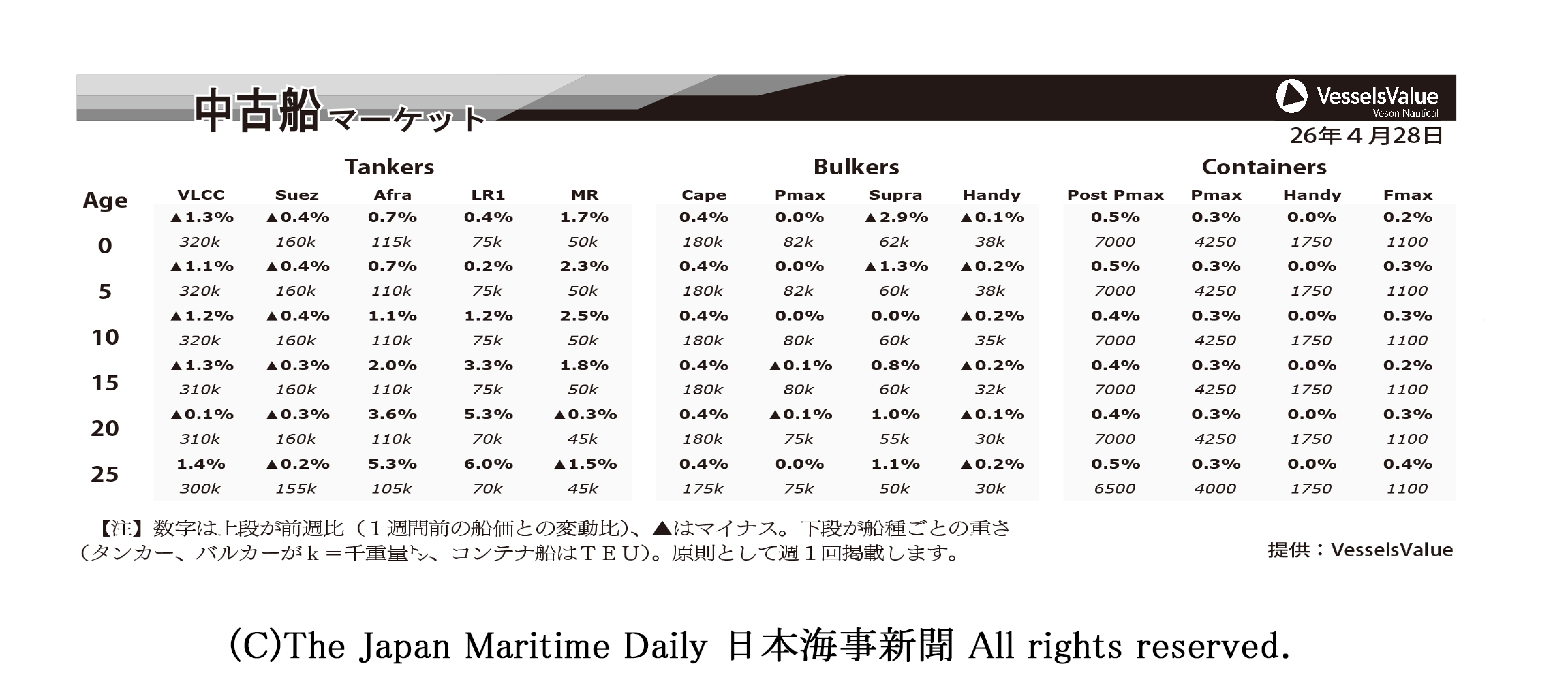 ■中古船マーケット 注)数字は上段が前週比(1週間前の船価との変動比)、▲はマイナス。下段が船種ごとの重さ(タンカー、バルカーがK=千重量トン、コンテナ船はTEU)。原則として週1回掲載します。
