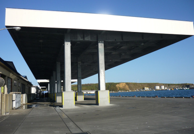 、屋根付き岸壁 供用。漁獲物を雨・日射から守る