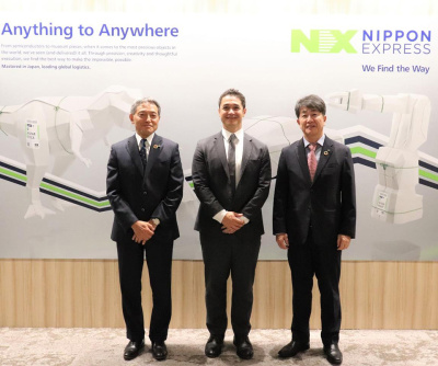 (左から)日本通運の安藤恒夫執行役員、SMCのサミエル・ネフ取締役執行役員、日本通運の奥平幸三執行役員