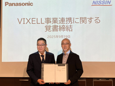 VIXELL事業連携に関する覚書を締結した日新の木村国雄常務執行役員(左)とパナソニックくらしアプライアンス社の森本亘冷熱デバイスビジネスユニット長