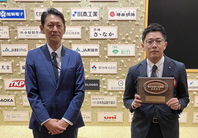 授与式に出席した鈴与カーゴサービス北関東の石井斉代表取締役社長(左)と鈴与第三DC事業部の益岡佑輔部長