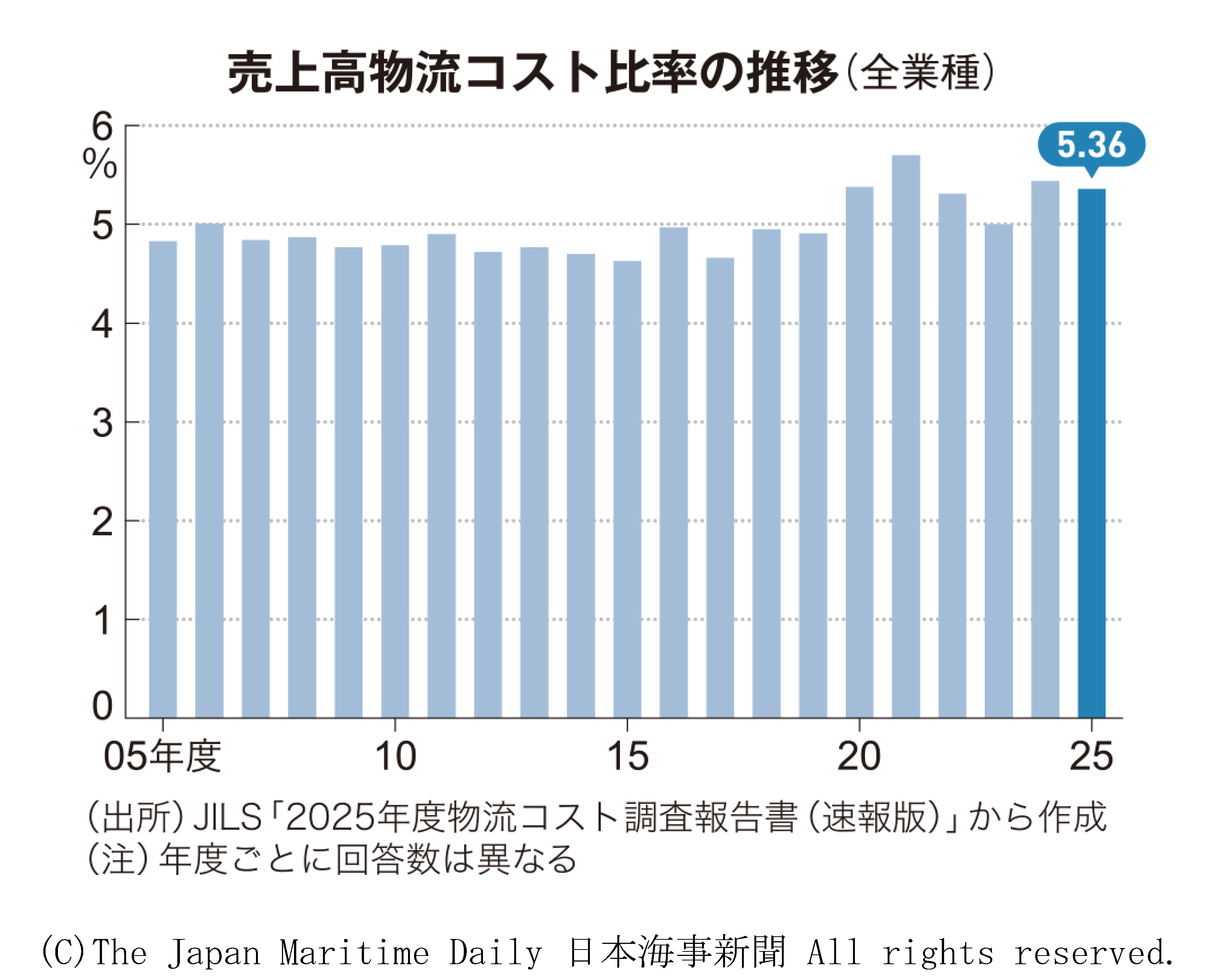 日本ロジスティクスシステム協会(JILS)がまとめた「2025年度物流コスト調査報告書(速報版)」によると、荷主企業196社の24年度(25年度調査)の売上高物流コスト比率は全業種平均で5・36%だ