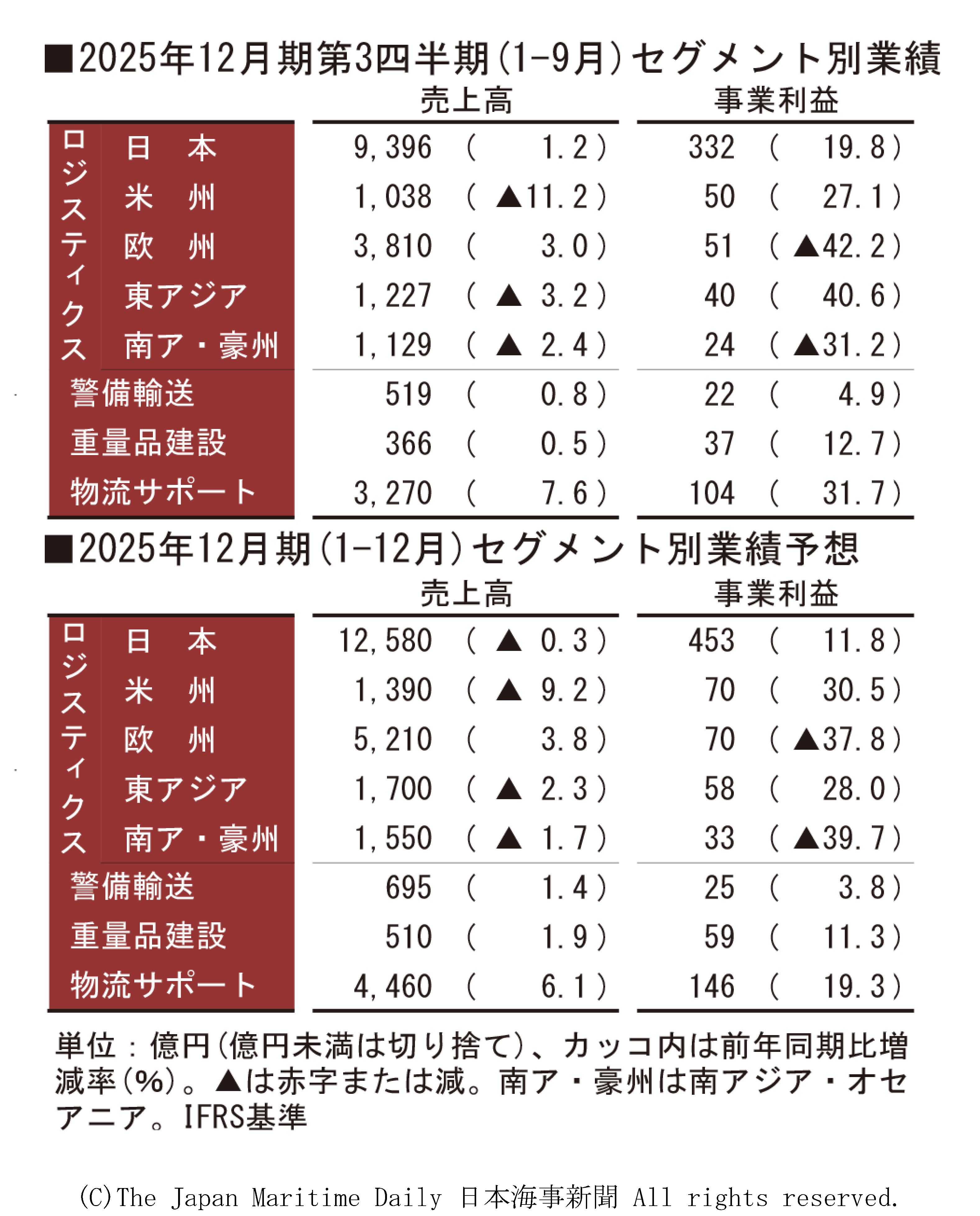 NIPPON EXPRESSホールディングス(NXHD)の2025年1―9月期業績は、売上高が前年同期比0・4%増の1兆9085億円、営業利益が9%増の380億円だった。2月に買収を完了した独物流企
