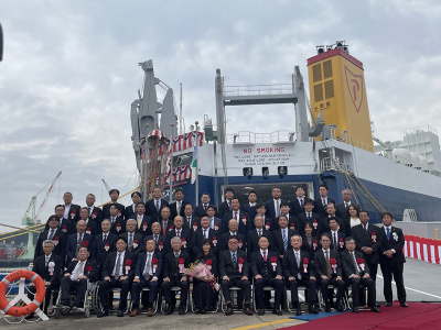 「プリンセス ベル」を背に関係者が集合(新来島どっく大西工場2号岸壁)