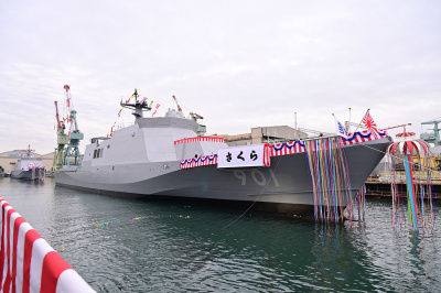 ジャパンマリンユナイテッド(JMU)横浜事業所磯子工場で13日、防衛省が発注した哨戒艦(OPV)「さくら」「たちばな」(基準排水量1900トン)の命名・進水式が行われた。同艦はこれまで海上自衛隊が保