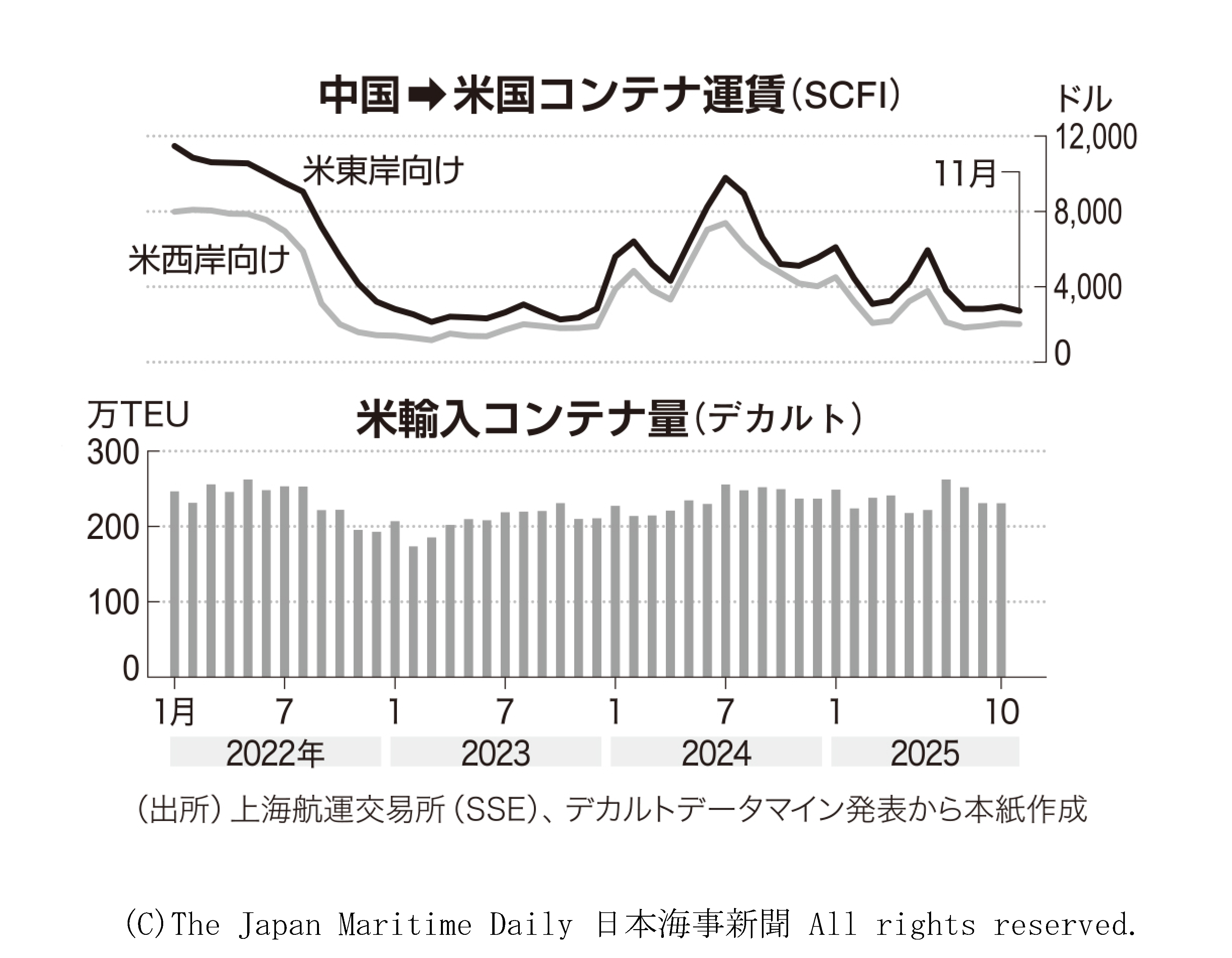 %E3%80%80%E7%B1%B3%E5%9B%BD%E3%81%AE%E8%BC%B8%E5%85%A5%3Cdiv+class%3D%27kiji_relation%27%3E%3Cb%3E%E3%82%B3%3C%2Fb%3E%3Cb%3E%E3%83%B3%3C%2Fb%3E%3Cb%3E%E3%83%86%3C%2Fb%3E%3Cb%3E%E3%83%8A%3C%2Fb%3E%3Cdiv+class%3Drel_link%3E%3Ca+href%3D%27%2Fstatic%2Fja%2Fcontainer%2FcontainerNational.html%27+target%3D%27_blank%27%3E%E5%9B%BD%E5%86%85%E6%B8%AF%E3%81%AE%E5%A4%96%E8%B3%87%E3%82%B3%E3%83%B3%E3%83%86%E3%83%8A%E5%8F%96%E6%89%B1%E9%87%8F%3C%2Fa%3E%3C%2Fdiv%3E%3C%2Fdiv%3E%E9%87%8F%E3%81%8C%E5%B9%B4%E6%9C%AB%E3%81%AB%E3%81%8B%E3%81%91%E3%81%A6%E5%A4%A7%E5%B9%85%E3%81%AB%E8%90%BD%E3%81%A1%E8%BE%BC%E3%82%80%E8%A6%8B%E9%80%9A%E3%81%97%E3%81%A0%E3%80%82%E7%B1%B3%E7%89%A9%E6%B5%81%E3%83%87%E3%83%BC%E3%82%BF%E4%BC%81%E6%A5%ADVIZION%E3%81%8C18%E6%97%A5%E7%99%BA%E8%A1%A8%E3%81%97%E3%81%9F%E4%BA%88%E6%B8%AC%E3%81%A7%E3%81%AF%E3%80%8112%E6%9C%88%E3%81%AE%E7%B1%B3%E8%BC%B8%E5%85%A5%E3%82%B3%E3%83%B3%E3%83%86%E3%83%8A%E5%8F%96%E6%89%B1%E9%87%8F%E3%81%AF%E5%89%8D%E5%B9%B4%E5%90%8C%E6%9C%88%E6%AF%9417%25%E6%B8%9B%E3%81%AE219%E4%B8%873000TEU%E3%81%A8%E3%81%AA%E3%82%8B%E8%A6%8B%E9%80%9A%E3%81%97%E3%80%82%E7%89%B9%E3%81%AB%E3%82%B9%E3%83%9D%E3%83%83%E3%83%88%E8%B2%A8%E7%89%A9%E3%81%8C%E8%90%BD%E3%81%A1%E8%BE%BC%E3%82%80%E3%80%82%E7%B1%B3%E4%B8%AD%E3%81%8C%E7%9B%B8%E4%BA%92%E3%81%AB%E8%BF%BD%E5%8A%A0%E9%96%A2%E7%A8%8E%E3%82%92%E4%B8%80%E6%99%82%E5%81%9C%E6%AD%A2%E3%81%97%E3%81%9F%E3%81%93%E3%81%A8%E3%81%AB%E4%BC%B4%E3%81%86%E5%89%8D%E5%80%92%E3%81%97%E9%9C%80%E8%A6%81%E3%81%AE%E5%86%8D%E7%87%83%E3%82%82%E6%9C%9F%E5%BE%85%E3%81%95%E3%82%8C%E3%82%8B%E3%81%8C%E3%80%81%E7%8F%BE%E6%99%82%E7%82%B9%E3%81%A7%E3%81%AF%E8%BC%B8%E5%85%A5%E9%87%8F%E3%82%92%E6%8A%BC%E3%81%97%E4%B8%8A%E3%81%92%E3%82%8B%E3%83%87%E3%83%BC%E3%82%BF%E3%81%8C%E8%A6%8B%E5%BD%93%E3%81%9F%E3%82%89%E3%81%AA%E3%81%84%E3%80%82%3Cbr%3E%E3%80%80VIZION%E3%81%AB%E3%82%88%E3%82%8B%E3%81%A8%E3%80%8112%E6%9C%88%E3%81%AF%E9%95%B7%E6%9C%9F%E5%A5%91%E7%B4%84%E9%81%8B%E8%B3%83%E3%81%AB%E3%82%88%E3%82%8B%E3%80%8C%E8%A8%88%E7%94%BB%E6%B8%88%E3%81%BF%E8%B2%A8%E7%89%A9%E3%80%8D%E3%81%8C%E4%BE%8B%E5%B9%B4%E4%B8%A6%E3%81%BF%E3%82%92%E7%B6%AD%E6%8C%81%E3%81%99%E3%82%8B%E4%B8%80%E6%96%B9%E3%80%81%E5%A4%8F%E5%A0%B4%E3%81%BE%E3%81%A7%E7%89%A9%E9%87%8F%E3%82%92%E6%8A%BC%E3%81%97%E4%B8%8A%E3%81%92%E3%81%A6%E3%81%8D%E3%81%9F%E3%82%B9%E3%83%9D%E3%83%83%E3%83%88%E8%B2%A8%E7%89%A9%E3%81%8C%E6%80%A5%E6%B8%9B%E3%80%82%E8%A8%88%E7%94%BB%E6%B8%88%E3%81%BF%E8%B2%A8%E7%89%A9%E3%81%8C%E6%AF%8E%E9%80%B125%E4%B8%87TEU%E3%81%A7%E5%AE%89%E5%AE%9A%E6%8E%A8%E7%A7%BB%E3%81%99%E3%82%8B%E4%B8%80%E6%96%B9%E3%80%81%E3%82%B9%E3%83%9D%E3%83%83%E3%83%88%E8%B2%A8%E7%89%A9%E3%81%AF%E7%AC%AC1%E9%80%B1%E3%81%AE40%E4%B8%87TEU%E3%81%8B%E3%82%89%E6%9C%80%E7%B5%82%E9%80%B1%E3%81%AB%E3%81%AF17%E4%B8%87TEU%E4%BD%99%E3%82%8A%E3%81%A8%E3%80%81%E9%80%B1%E3%82%92%E8%BF%BD%E3%81%A3%E3%81%A6%E6%80%A5%E6%B8%9B%E3%81%99%E3%82%8B%E3%80%82%3Cbr%3E%E3%80%80%E5%B9%B4%E6%9C%AB%E5%95%86%E6%88%A6%E5%90%91%E3%81%91%E9%9C%80%E8%A6%81%E3%81%8C%E5%8F%8E%E6%9D%9F%E3%81%99%E3%82%8B12%E6%9C%88%E3%81%AB%E8%BC%B8%E5%85%A5%E3%82%B3%E3%83%B3%E3%83%86%E3%83%8A%E9%87%8F%E3%81%AE%E5%8F%96%E3%82%8A%E6%89%B1%E3%81%84%E6%B0%B4%E6%BA%96%E3%81%8C%E8%90%BD%E3%81%A1%E3%82%8B%E3%81%AE%E3%81%AF%E4%BE%8B%E5%B9%B4%E9%80%9A%E3%82%8A%E3%81%AE%E5%8B%95%E3%81%8D%E3%81%A0%E3%80%82%E3%83%87%E3%82%AB%E3%83%AB%E3%83%88%E3%83%87%E3%83%BC%E3%82%BF%E3%83%9E%E3%82%A4%E3%83%B3%E3%81%8C%E7%99%BA%E8%A1%A8%E3%81%97%E3%81%9F10%E6%9C%88%E3%81%AE%E7%B1%B3%E8%BC%B8%E5%85%A5%E3%82%B3%E3%83%B3%E3%83%86%E3%83%8A%E9%87%8F%E3%81%AF231%E4%B8%87TEU%E3%81%A7%E3%80%8112%E6%9C%88%E3%81%AB220%E4%B8%87TEU%E3%82%92%E5%89%B2%E3%82%8A%E8%BE%BC%E3%82%93%E3%81%A0%E3%81%A8%E3%81%97%E3%81%A6%E3%82%82%E3%80%81%E6%98%A8%E5%B9%B4%E4%B8%A6%E3%81%BF%E3%81%AE%E6%B8%9B%E5%B0%91%E5%B9%85%E3%81%AB%E3%81%A8%E3%81%A9%E3%81%BE%E3%82%8B%E3%80%82%3Cbr%3E%E3%80%80%E7%B1%B3%E5%9B%BD%E3%81%AE%E8%BC%B8%E5%85%A5%E3%82%B3%E3%83%B3%E3%83%86%E3%83%8A%E9%87%8F%E3%81%AF%E3%80%817%E3%80%818%E6%9C%88%E3%81%AB%E7%B1%B3%E9%96%A2%E7%A8%8E%E7%99%BA%E5%8B%95%E5%89%8D%E3%81%AE%E9%A7%86%E3%81%91%E8%BE%BC%E3%81%BF%E9%9C%80%E8%A6%81%E3%82%92%E5%8F%97%E3%81%91%E3%81%A6%E9%81%8E%E5%8E%BB%E6%9C%80%E9%AB%98%E6%B0%B4%E6%BA%96%E3%82%92%E8%A8%98%E9%8C%B2%E3%80%82%E3%81%93%E3%82%8C%E3%82%92%E5%8F%97%E3%81%91%E3%81%A6%E3%80%8110%E2%80%9512%E6%9C%88%E3%81%AE%E7%89%A9%E9%87%8F%E3%81%AB%E3%81%A4%E3%81%84%E3%81%A6%E3%81%AF%E3%82%88%E3%82%8A%E6%82%B2%E8%A6%B3%E7%9A%84%E3%81%AA%E4%BA%88%E6%B8%AC%E3%82%82%E8%A6%8B%E3%82%89%E3%82%8C%E3%81%9F%E3%81%8C%E3%80%81%E5%AE%9F%E9%9A%9B%E3%81%AB%E3%81%AF%E4%BA%88%E6%B8%AC%E3%81%95%E3%82%8C%E3%81%9F%E3%82%88%E3%82%8A%E3%82%82%E5%A0%85%E8%AA%BF%E3%81%AA%E8%8D%B7%E5%8B%95%E3%81%8D%E3%81%8C%E7%B6%9A%E3%81%84%E3%81%A6%E3%81%84%E3%82%8B%E3%81%A8%E8%A8%80%E3%81%88%E3%82%8B%E3%80%82%E5%89%8D%E5%B9%B4%E6%AF%94%E3%81%A7%E3%81%AE%E6%B8%9B%E5%B0%91%E5%B9%85%E3%81%8C%E5%A4%A7%E3%81%8D%E3%81%8F%E5%87%BA%E3%82%8B%E8%83%8C%E6%99%AF%E3%81%AB%E3%81%AF%E3%80%81%E6%98%A8%E5%B9%B4%E3%81%AE%E5%90%8C%E6%99%82%E6%9C%9F%E3%81%AB%E5%8C%97%E7%B1%B3%E3%81%A7%E6%B8%AF%E6%B9%BE%E3%82%B9%E3%83%88%E3%81%AE%E6%87%B8%E5%BF%B5%E3%81%8C%E9%AB%98%E3%81%BE%E3%81%A3%E3%81%A6%E3%81%84%E3%81%9F%E7%89%B9%E6%AE%8A%E8%A6%81%E5%9B%A0%E3%82%82%E3%81%82%E3%82%8B%E3%80%82VIZION%E3%81%AA%E3%81%A9%E3%81%8C%E7%84%A6%E7%82%B9%E3%81%AB%E6%8D%AE%E3%81%88%E3%82%8B%E3%81%AE%E3%81%AF%E3%80%81%E7%B1%B3%E4%B8%AD%E3%81%8C%E8%BF%BD%E5%8A%A0%E9%96%A2%E7%A8%8E%E3%82%92%E4%B8%80%E6%99%82%E5%81%9C%E6%AD%A2%E3%81%97%E3%81%9F%E3%81%AB%E3%82%82%E3%81%8B%E3%81%8B%E3%82%8F%E3%82%89%E3%81%9A%E3%80%81%E7%B1%B3%E5%B0%8F%E5%A3%B2%E6%A5%AD%E8%80%85%E3%81%AB%E5%9C%A8%E5%BA%AB%E6%8B%A1%E5%85%85%E3%81%AE%E5%8B%95%E3%81%8D%E3%81%8C%E3%81%BB%E3%81%BC%E8%A6%8B%E3%82%89%E3%82%8C%E3%81%AA%E3%81%84%E7%82%B9%E3%81%A0%E3%80%82%3Cbr%3E%E3%80%80%E2%96%A0%E9%81%8B%E8%B3%83%E3%81%95%E3%82%89%E3%81%AB%E4%B8%8B%E8%90%BD%E3%82%82%3Cbr%3E%E3%80%80%E4%B8%8A%E6%B5%B7%E8%88%AA%E9%81%8B%E4%BA%A4%E6%98%93%E6%89%80%28SSE%29%E3%81%8C%E3%81%BE%E3%81%A8%E3%82%81%E3%82%8B%E4%B8%8A%E6%B5%B7%E7%99%BA%E3%82