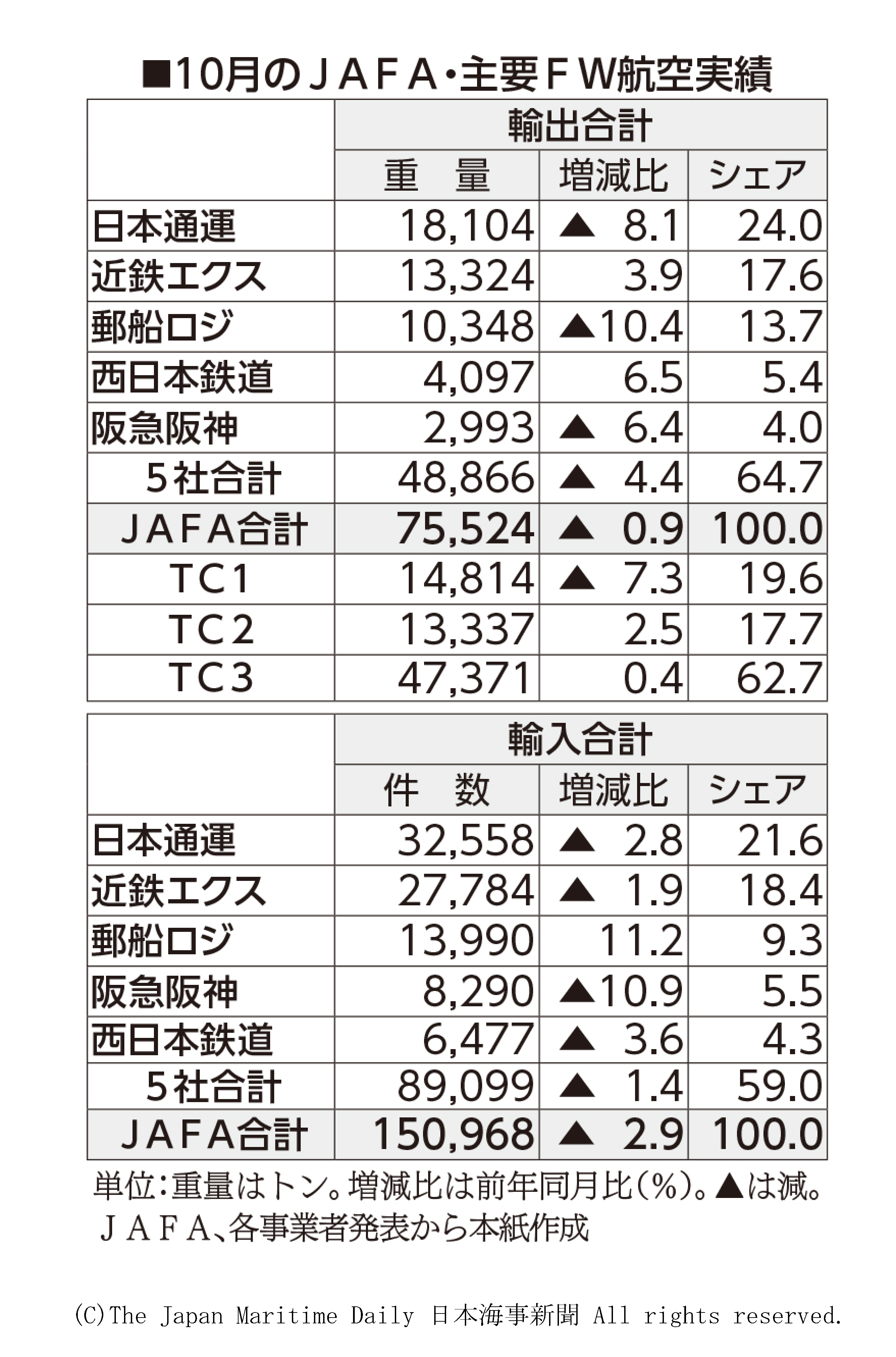 航空貨物運送協会(JAFA)が21日発表した10月の日本発輸出航空混載重量は、前年同月比0・9%減の7万5524トンと2カ月ぶりに前年割れとなった。欧州、アジアが前年比プラスも微増にとどまり、米州向