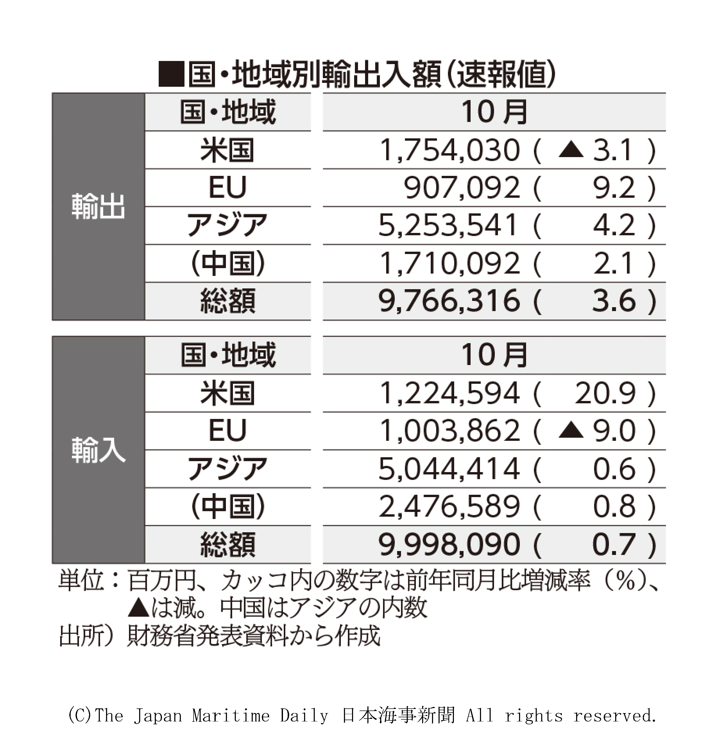 %E3%80%80%E8%B2%A1%E5%8B%99%E7%9C%81%E3%81%AE%3Cb%3E%E8%B2%BF%E6%98%93%E7%B5%B1%E8%A8%88%3C%2Fb%3E%28%E9%80%9F%E5%A0%B1%29%E3%81%AB%E3%82%88%E3%82%8B%E3%81%A8%E3%80%8110%E6%9C%88%E3%81%AE%E8%BC%B8%E5%87%BA%E9%A1%8D%E3%81%AF%E5%89%8D%E5%B9%B4%E5%90%8C%E6%9C%88%E6%AF%944%25%E5%A2%97%E3%81%AE9%E5%85%867663%E5%84%84%E5%86%86%E3%81%A82%E3%82%AB%E6%9C%88%E9%80%A3%E7%B6%9A%E3%81%A7%E5%A2%97%E5%8A%A0%E3%81%97%E3%81%9F%E3%80%82%E4%B8%AD%E5%9B%BD%E3%83%BB%E3%82%A2%E3%82%B8%E3%82%A2%E5%90%91%E3%81%91%E3%81%AE%E5%8D%8A%E5%B0%8E%E4%BD%93%E7%AD%89%E9%9B%BB%E5%AD%90%E9%83%A8%E5%93%81%E3%80%81EU%28%E6%AC%A7%E5%B7%9E%E9%80%A3%E5%90%88%29%E5%90%91%E3%81%91%E3%81%AE%E5%8E%9F%E5%8B%95%E6%A9%9F%E3%81%AA%E3%81%A9%E3%81%8C%E5%AE%9F%E7%B8%BE%E3%82%92%E6%8A%BC%E3%81%97%E4%B8%8A%E3%81%92%E3%80%8110%E6%9C%88%E5%8D%98%E6%9C%88%E3%81%A8%E3%81%97%E3%81%A6%E3%81%AF%E9%81%8E%E5%8E%BB%E6%9C%80%E9%AB%98%E3%82%92%E8%A8%98%E9%8C%B2%E3%81%97%E3%81%9F%E3%80%82%E7%B1%B3%E5%9B%BD%E5%90%91%E3%81%91%E3%81%AF7%E3%82%AB%E6%9C%88%E9%80%A3%E7%B6%9A%E3%81%A7%E6%B8%9B%E5%B0%91%E3%81%97%E3%81%9F%E3%82%82%E3%81%AE%E3%81%AE%E3%80%81%E6%B8%9B%E5%B0%91%E5%B9%85%E3%81%8C1%E6%A1%81%E5%8F%B0%E3%81%AB%E7%B8%AE%E5%B0%8F%E3%81%97%E3%81%9F%E3%80%82%E8%BC%B8%E5%85%A5%E9%A1%8D%E3%81%AF0%E3%83%BB7%25%E5%A2%97%E3%81%AE9%E5%85%869981%E5%84%84%E5%86%86%E3%81%A8%E3%81%AA%E3%82%8A%E3%80%81%E3%81%93%E3%82%8C%E3%82%822%E3%82%AB%E6%9C%88%E9%80%A3%E7%B6%9A%E3%81%AE%E3%83%97%E3%83%A9%E3%82%B9%E3%81%A0%E3%81%A3%E3%81%9F%E3%80%82%E8%B2%BF%E6%98%93%E5%8F%8E%E6%94%AF%E3%81%AF2318%E5%84%84%E5%86%86%E3%81%AE%E8%B5%A4%E5%AD%97%E3%81%A7%E3%80%81%E8%B5%A4%E5%AD%97%E3%81%AF4%E3%82%AB%E6%9C%88%E9%80%A3%E7%B6%9A%E3%80%82%3Cbr%3E%E3%80%80%E6%95%B0%E9%87%8F%E6%8C%87%E6%95%B0%E3%81%AF%E8%BC%B8%E5%87%BA%E3%81%8C1%25%E6%B8%9B%E3%81%AE108%E3%83%BB3%E3%81%A83%E3%82%AB%E6%9C%88%E9%80%A3%E7%B6%9A%E3%81%A7%E5%89%8D%E5%B9%B4%E3%82%92%E4%B8%8B%E5%9B%9E%E3%81%A3%E3%81%9F%E3%80%82%E8%BC%B8%E5%85%A5%E3%81%AF2%25%E5%A2%97%E3%81%AE106%E3%83%BB9%E3%81%A72%E3%82%AB%E6%9C%88%E9%80%A3%E7%B6%9A%E3%81%A7%E5%A2%97%E5%8A%A0%E3%81%97%E3%81%9F%E3%80%82%3Cbr%3E%E3%80%80%E5%9B%BD%E3%83%BB%E5%9C%B0%E5%9F%9F%E5%88%A5%E3%81%AE%E8%BC%B8%E5%87%BA%E9%A1%8D%E3%82%92%E8%A6%8B%E3%82%8B%E3%81%A8%E3%80%81%E7%B1%B3%E5%9B%BD%E5%90%91%E3%81%91%E3%81%AF3%25%E6%B8%9B%E3%81%AE1%E5%85%867540%E5%84%84%E5%86%86%E3%81%A0%E3%81%A3%E3%81%9F%E3%80%82%E8%87%AA%E5%8B%95%E8%BB%8A%E3%81%8C8%25%E6%B8%9B%E3%80%81%E5%8D%8A%E5%B0%8E%E4%BD%93%E7%AD%89%E8%A3%BD%E9%80%A0%E8%A3%85%E7%BD%AE%E3%81%8C50%25%E6%B8%9B%E3%80%81%E5%8C%BB%E8%96%AC%E5%93%81%E3%81%8C31%25%E6%B8%9B%E3%81%AA%E3%81%A9%E3%81%AB%E8%90%BD%E3%81%A1%E8%BE%BC%E3%82%93%E3%81%A0%E3%80%82%E8%87%AA%E5%8B%95%E8%BB%8A%E3%81%AE%E8%BC%B8%E5%87%BA%E5%8F%B0%E6%95%B0%E3%81%AF0%E3%83%BB9%25%E6%B8%9B%E3%81%AE11%E4%B8%879028%E5%8F%B0%E3%80%82%E3%83%90%E3%82%B9%E3%83%BB%E3%83%88%E3%83%A9%E3%83%83%E3%82%AF%E3%81%8C30%25%E6%B8%9B%E3%81%A0%E3%81%A3%E3%81%9F%E3%81%8C%E3%80%81%E4%B9%97%E7%94%A8%E8%BB%8A%E3%81%AF0%E3%83%BB5%25%E6%B8%9B%E3%81%A0%E3%81%A3%E3%81%9F%E3%80%82%E8%87%AA%E5%8B%95%E8%BB%8A%E3%81%AE%E9%83%A8%E5%88%86%E5%93%81%E3%81%AE%E8%BC%B8%E5%87%BA%E9%87%8F%E3%81%AF4%25%E6%B8%9B%E3%81%AE4%E4%B8%875515%E3%83%88%E3%83%B3%E3%81%A0%E3%81%A3%E3%81%9F%E3%80%82%3Cbr%3E%E3%80%80%E3%81%93%E3%82%8C%E3%81%AB%E5%AF%BE%E3%81%97%E3%81%A6%E3%80%81EU%E3%80%81%E3%82%A2%E3%82%B8%E3%82%A2%E5%90%91%E3%81%91%E3%81%AF%E3%81%84%E3%81%9A%E3%82%8C%E3%82%823%E3%82%AB%E6%9C%88%E9%80%A3%E7%B6%9A%E3%81%A7%E5%A2%97%E5%8A%A0%E3%81%97%E3%81%9F%E3%80%82EU%E3%81%AF9%25%E5%A2%97%E3%81%AE9071%E5%84%84%E5%86%86%E3%80%82%E5%8E%9F%E5%8B%95%E6%A9%9F%E3%81%8C51%25%E5%A2%97%E3%81%A0%E3%81%A3%E3%81%9F%E3%81%BB%E3%81%8B%E3%80%81%E5%8D%8A%E5%B0%8E%E4%BD%93%E7%AD%89%E9%9B%BB%E5%AD%90%E9%83%A8%E5%93%81%E3%81%8C42%25%E5%A2%97%E3%80%81%E4%BA%8C%E8%BC%AA%E8%87%AA%E5%8B%95%E8%BB%8A%E3%81%8C36%25%E5%A2%97%E3%81%A8%E5%A4%A7%E5%B9%85%E3%81%AB%E4%BC%B8%E3%81%B3%E3%81%9F%E3%80%82%3Cbr%3E%E3%80%80%E3%82%A2%E3%82%B8%E3%82%A2%E3%81%AF4%25%E5%A2%97%E3%81%AE5%E5%85%862535%E5%84%84%E5%86%86%E3%80%81%E4%B8%AD%E5%9B%BD%E3%81%AF2%25%E5%A2%97%E3%81%AE1%E5%85%867101%E5%84%84%E5%86%86%E3%81%A0%E3%81%A3%E3%81%9F%E3%80%82%E3%81%9D%E3%82%8C%E3%81%9E%E3%82%8C%E5%8D%8A%E5%B0%8E%E4%BD%93%E7%AD%89%E9%9B%BB%E5%AD%90%E9%83%A8%E5%93%81%E3%81%8C2%E5%89%B2%E8%BF%91%E3%81%8F%E5%A2%97%E5%8A%A0%E3%81%97%E3%81%9F%E3%80%82%3Cbr%3E%E3%80%80%E5%9B%BD%E3%83%BB%E5%9C%B0%E5%9F%9F%E5%88%A5%E3%81%AE%E8%BC%B8%E5%85%A5%E9%A1%8D%E3%81%A7%E3%81%AF%E7%B1%B3%E5%9B%BD%E3%80%81%E3%82%A2%E3%82%B8%E3%82%A2%E3%80%81%E4%B8%AD%E5%9B%BD%E5%87%BA%E3%81%97%E3%81%A7%E5%A2%97%E5%8B%A2%E3%81%8C%E7%B6%9A%E3%81%84%E3%81%9F%E3%80%82%E7%B1%B3%E5%9B%BD%E3%81%AF%E8%88%AA%E7%A9%BA%E6%A9%9F%E9%A1%9E%E3%81%AA%E3%81%A9%E3%81%8C%E5%A2%97%E5%8A%A0%E3%81%97%E3%80%8121%25%E5%A2%97%E3%81%AE1%E5%85%862246%E5%84%84%E5%86%86%E3%80%82%E3%82%A2%E3%82%B8%E3%82%A2%E3%80%81%E4%B8%AD%E5%9B%BD%E3%81%AF%E5%91%A8%E8%BE%BA%E6%A9%9F%E5%99%A8%E5%90%AB%E3%82%80%E9%9B%BB%E7%AE%97%E6%A9%9F%E9%A1%9E%E3%81%AA%E3%81%A9%E3%81%8C%E5%A5%BD%E8%AA%BF%E3%81%A7%E3%80%81%E3%82%A2%E3%82%B8%E3%82%A2%E3%81%8C0%E3%83%BB6%25%E5%A2%97%E3%81%AE5%E5%85%86444%E5%84%84%E5%86%86%E3%80%81%E4%B8%AD%E5%9B%BD%E3%81%8C0%E3%83%BB8%25%E5%A2%97%E3%81%AE2%E5%85%864766%E5%84%84%E5%86%86%E3%81%A0%E3%81%A3%E3%81%9F%E3%80%82%3Cbr%3E%E3%80%80%E4%B8%80%E6%96%B9%E3%80%81EU%E5%87%BA%E3%81%97%E3%81%AF%E5%8C%BB%E8%96%AC%E5%93%81%E3%81%AA%E3%81%A9%E3%81%8C%E4%BD%8E%E8%AA%BF%E3%81%A79%25%E6%B8%9B%E3%81%AE1%E5%85%8639%E5%84%84%E5%86%86%E3%81%A8%E3%81%AA%E3%82%8A%E3%80%812%E3%82%AB%E6%9C%88%E3%81%B6%E3%82%8A%E3%81%AE%E5%89%8D%E5%B9%B4%E5%89%B2%E3%82%8C%E3%81%A0%E3%81%A3%E3%81%9F%E3%80%82%3Cbr%3E%E3%80%80%E7%82%BA%E6%9B%BF%E3%83%AC%E3%83%BC%E3%83%88%28%E7%A8%8E%E9%96%A2%E9%95%B7%E5%85%AC%E7%A4%BA%E3%83%AC%E3%83%BC%E3%83%88%E3%81%AE%E5%B9%B3%E5%9D%87%29%E3%81%AF1%E3%83%89%E3%83%AB%3D149%E3%83%BB51%E5%86%86%E3%80%82%E5%89%8D%E5%B9%B4%E5%90%8C%E6%9C%88%E6%AF%943%25%E3%81%AE%E5%86%86%E5%AE%89%E3%80%82%3Cbr%3E%E3%80%80%E8%B2%A1%E5%8B%99%E7%9C%81%E3%81%AF19%E6%97%A5%E3%81%
