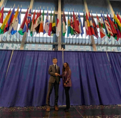 国務省内の国旗の下にて(国務省国際訪問者局担当官〈右〉と筆者)