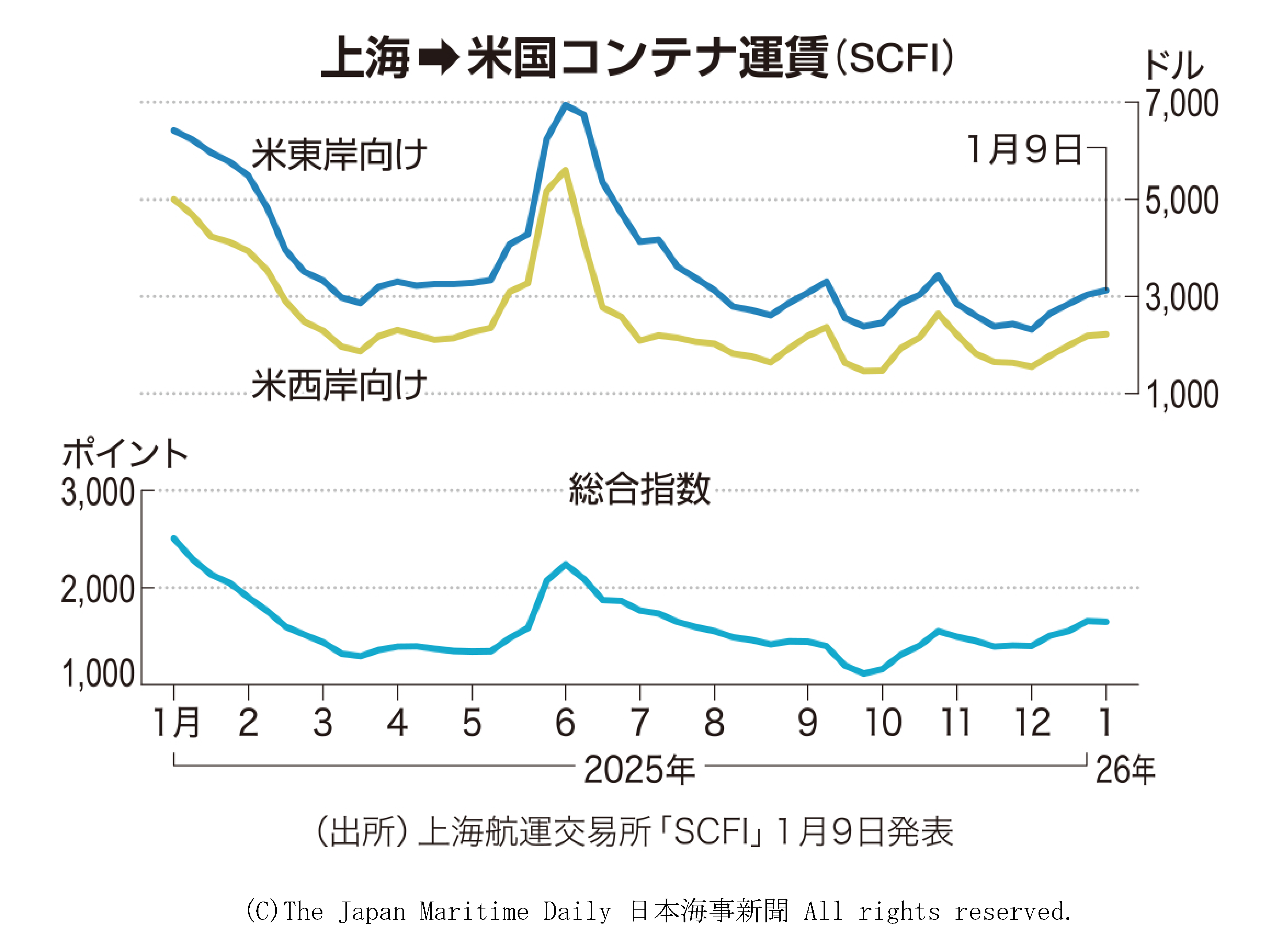 上海航運交易所(SSE)がまとめた9日付の上海発コンテナ運賃指数(SCFI)は、欧米など主要航路が続伸した。北米、欧州とも1桁台前半の小幅高ながら上昇基調を維持。中華圏の旧正月も控え、主要船社による