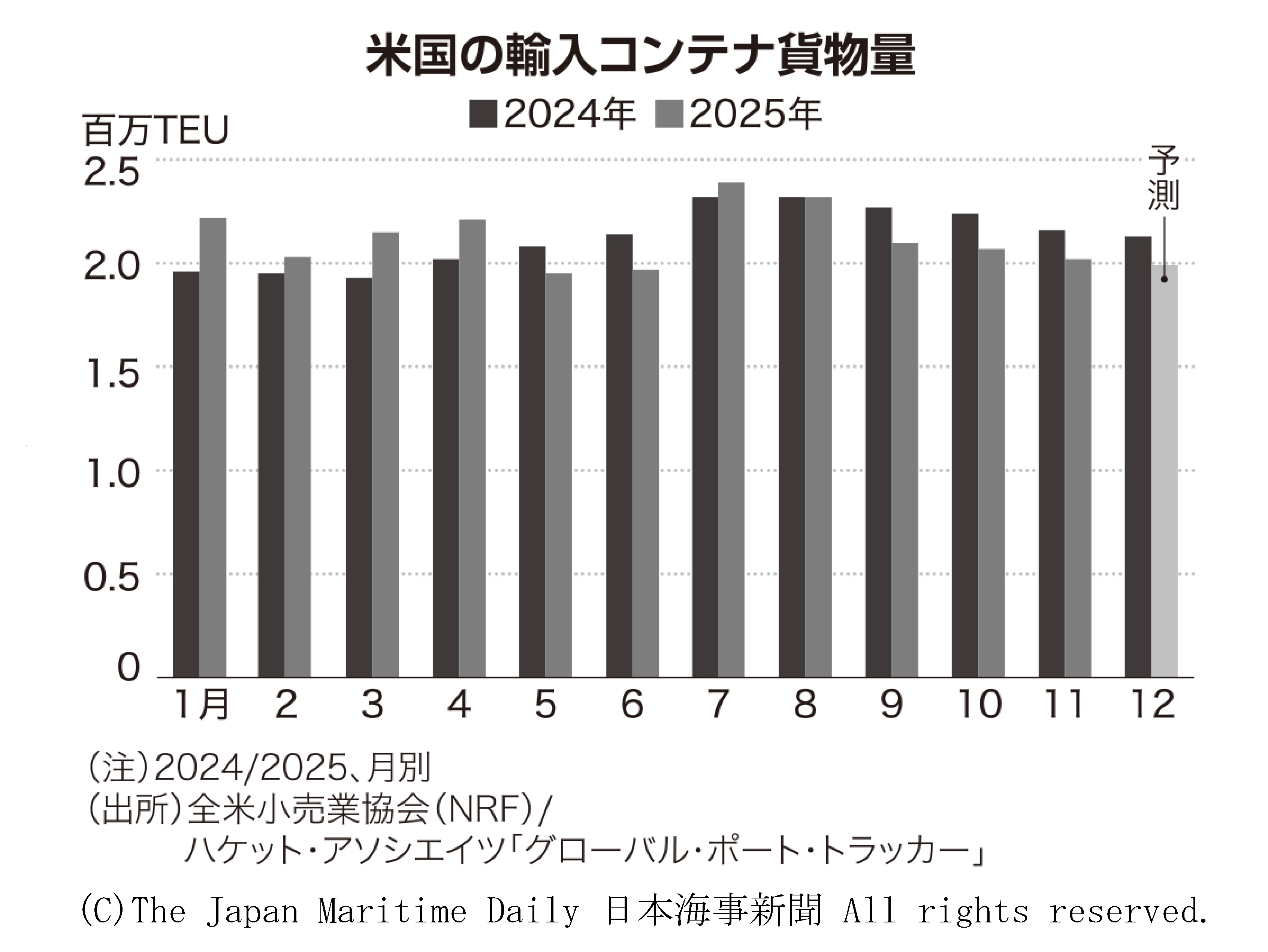 %E3%80%80%E5%85%A8%E7%B1%B3%E5%B0%8F%E5%A3%B2%E6%A5%AD%E5%8D%94%E4%BC%9A%28NRF%29%E3%81%A8%E7%89%A9%E6%B5%81%E3%82%B3%E3%83%B3%E3%82%B5%E3%83%AB%E3%82%BF%E3%83%B3%E3%83%88%E3%81%AE%E3%83%8F%E3%82%B1%E3%83%83%E3%83%88%E3%83%BB%E3%82%A2%E3%82%BD%E3%82%B7%E3%82%A8%E3%82%A4%E3%83%84%E3%81%8C9%E6%97%A5%E7%99%BA%E8%A1%A8%E3%81%97%E3%81%9F%E3%80%8C%E3%82%B0%E3%83%AD%E3%83%BC%E3%83%90%E3%83%AB%E3%83%BB%E3%83%9D%E3%83%BC%E3%83%88%E3%83%BB%E3%83%88%E3%83%A9%E3%83%83%E3%82%AB%E3%83%BC%28GPT%29%E3%80%8D%E3%81%AB%E3%82%88%E3%82%8B%E3%81%A8%E3%80%81%E7%B1%B3%E4%B8%BB%E8%A6%81%E6%B8%AF%E6%B9%BE%E3%81%AE%E5%B0%8F%E5%A3%B2%E6%A5%AD%E5%90%91%E3%81%91%E8%BC%B8%E5%85%A5%3Cdiv+class%3D%27kiji_relation%27%3E%3Cb%3E%E3%82%B3%3C%2Fb%3E%3Cb%3E%E3%83%B3%3C%2Fb%3E%3Cb%3E%E3%83%86%3C%2Fb%3E%3Cb%3E%E3%83%8A%3C%2Fb%3E%3Cdiv+class%3Drel_link%3E%3Ca+href%3D%27%2Fstatic%2Fja%2Fcontainer%2FcontainerNational.html%27+target%3D%27_blank%27%3E%E5%9B%BD%E5%86%85%E6%B8%AF%E3%81%AE%E5%A4%96%E8%B3%87%E3%82%B3%E3%83%B3%E3%83%86%E3%83%8A%E5%8F%96%E6%89%B1%E9%87%8F%3C%2Fa%3E%3C%2Fdiv%3E%3C%2Fdiv%3E%E5%8F%96%E6%89%B1%E9%87%8F%E3%81%AF4%E6%9C%88%E3%81%BE%E3%81%A7%E5%89%8D%E5%B9%B4%E5%89%B2%E3%82%8C%E3%81%8C%E7%B6%9A%E3%81%8F%E8%A6%8B%E9%80%9A%E3%81%97%E3%81%A0%E3%80%82%E7%B1%B3%E9%96%A2%E7%A8%8E%E6%94%BF%E7%AD%96%E3%81%AE%E5%85%88%E8%A1%8C%E3%81%8D%E4%B8%8D%E9%80%8F%E6%98%8E%E6%84%9F%E3%81%AB%E5%8A%A0%E3%81%88%E3%80%81%E6%98%A8%E5%B9%B4%E5%BE%8C%E5%8D%8A%E3%81%AE%E5%89%8D%E5%80%92%E3%81%97%E8%BC%B8%E5%85%A5%E3%81%AE%E5%8F%8D%E5%8B%95%E3%81%8C%E8%8D%B7%E5%8B%95%E3%81%8D%E3%81%AE%E9%87%8D%E3%81%97%E3%81%AB%E3%81%AA%E3%82%8B%E3%80%82%E4%B8%AD%E8%8F%AF%E5%9C%8F%E3%81%AE%E6%97%A7%E6%AD%A3%E6%9C%88%E5%89%8D%E9%9C%80%E8%A6%81%E3%81%A7%E3%80%811%E6%9C%88%E3%81%AF%E5%89%8D%E6%9C%88%E6%AF%94%E3%81%A7%E3%83%97%E3%83%A9%E3%82%B9%E3%81%AB%E8%BB%A2%E3%81%98%E3%82%8B%E8%A6%8B%E8%BE%BC%E3%81%BF%E3%80%82%3Cbr%3E%E3%80%802026%E5%B9%B4%E3%81%AF%E5%BA%8F%E7%9B%A4%E3%81%8B%E3%82%89%E9%96%A2%E7%A8%8E%E5%95%8F%E9%A1%8C%E3%81%8C%E8%8D%B7%E5%8B%95%E3%81%8D%E3%81%AE%E4%B8%8B%E6%8A%BC%E3%81%97%E8%A6%81%E5%9B%A0%E3%81%A8%E3%81%AA%E3%82%8B%E3%80%8225%E5%B9%B4%E5%A4%8F%E5%A0%B4%E3%81%BE%E3%81%A7%E3%81%AB%E9%96%A2%E7%A8%8E%E5%9B%9E%E9%81%BF%E3%82%92%E7%9B%AE%E7%9A%84%E3%81%A8%E3%81%97%E3%81%9F%E5%89%8D%E5%80%92%E3%81%97%E8%BC%B8%E5%85%A5%E3%81%8C%E5%BA%83%E3%81%8C%E3%81%A3%E3%81%A6%E5%B0%8F%E5%A3%B2%E6%A5%AD%E8%80%85%E3%81%AE%E5%9C%A8%E5%BA%AB%E3%81%AF%E9%AB%98%E6%B0%B4%E6%BA%96%E3%81%AB%E3%81%82%E3%82%8A%E3%80%81%E5%BD%93%E9%9D%A2%E3%81%AF%E8%BC%B8%E5%85%A5%E9%9C%80%E8%A6%81%E3%82%92%E6%8A%91%E5%88%B6%E3%81%99%E3%82%8B%E3%81%A8%E3%81%BF%E3%82%89%E3%82%8C%E3%82%8B%E3%80%82%3Cbr%3E%E3%80%80GPT%E3%81%AE%E7%B1%B3%E5%B0%8F%E5%A3%B2%E3%82%8A%E5%90%91%E3%81%91%E8%BC%B8%E5%85%A5%E3%82%B3%E3%83%B3%E3%83%86%E3%83%8A%E5%8F%96%E6%89%B1%E9%87%8F%E3%81%AE%E4%BA%88%E6%B8%AC%E3%81%AB%E3%82%88%E3%82%8B%E3%81%A8%E3%80%811%E6%9C%88%E3%81%AF211%E4%B8%87TEU%E3%81%A8%E5%89%8D%E6%9C%88%E6%AF%94%E3%81%A7%E3%81%AF6%E3%82%AB%E6%9C%88%E3%81%B6%E3%82%8A%E3%81%AE%E5%A2%97%E5%8A%A0%E3%81%AB%E8%BB%A2%E3%81%98%E3%82%8B%E3%81%8C%E3%80%81%E5%89%8D%E5%B9%B4%E5%90%8C%E6%9C%88%E6%AF%94%E3%81%A7%E3%81%AF5%25%E6%B8%9B%E3%81%A8%E5%89%8D%E5%B9%B4%E5%89%B2%E3%82%8C%E3%81%AE%E3%81%BE%E3%81%BE%E3%81%A0%E3%80%82%3Cbr%3E%E3%80%802%E6%9C%88%E3%81%AF5%25%E6%B8%9B%E3%81%AE194%E4%B8%87TEU%E3%80%813%E6%9C%88%E3%81%AF12%25%E6%B8%9B%E3%81%AE188%E4%B8%87TEU%E3%80%814%E6%9C%88%E3%81%AF8%25%E6%B8%9B%E3%81%AE203%E4%B8%87TEU%E3%81%A8%E3%80%814%E3%82%AB%E6%9C%88%E9%80%A3%E7%B6%9A%E3%81%A7%E5%89%8D%E5%B9%B4%E5%89%B2%E3%82%8C%E3%81%8C%E7%B6%9A%E3%81%8F%E8%A6%8B%E9%80%9A%E3%81%97%E3%81%A0%E3%80%825%E6%9C%88%E3%81%AF6%25%E5%A2%97%E3%81%AE207%E4%B8%87TEU%E3%81%A8%E3%80%81%E6%98%A8%E5%B9%B48%E6%9C%88%E4%BB%A5%E6%9D%A5%E3%81%AE%E5%89%8D%E5%B9%B4%E5%90%8C%E6%9C%88%E6%AF%94%E3%83%97%E3%83%A9%E3%82%B9%E3%81%AB%E8%BB%A2%E3%81%98%E3%82%8B%E3%81%A8%E4%BA%88%E6%B8%AC%E3%81%97%E3%81%A6%E3%81%84%E3%82%8B%E3%80%82%3Cbr%3E%E3%80%80NRF%E3%81%AE%E3%82%B8%E3%83%A7%E3%83%8A%E3%82%B5%E3%83%B3%E3%83%BB%E3%82%B4%E3%83%BC%E3%83%AB%E3%83%89%E5%89%AF%E4%BC%9A%E9%95%B7%E3%81%AF%E3%80%8C%E6%97%A7%E6%AD%A3%E6%9C%88%E5%89%8D%E3%81%AB%E4%B8%80%E6%99%82%E7%9A%84%E3%81%AB%E8%BC%B8%E5%85%A5%E3%81%8C%E5%A2%97%E3%81%88%E3%82%8B%E5%8F%AF%E8%83%BD%E6%80%A7%E3%81%AF%E3%81%82%E3%82%8B%E3%81%8C%E3%80%81%E3%81%9D%E3%81%AE%E5%BE%8C%E3%81%AF%E4%BE%8B%E5%B9%B4%E9%80%9A%E3%82%8A%E5%B9%B4%E6%9C%AB%E5%95%86%E6%88%A6%E5%BE%8C%E3%81%AE%E8%8D%B7%E5%8B%95%E3%81%8D%E3%81%AE%E8%B0%B7%E9%96%93%E3%81%AB%E5%85%A5%E3%82%8B%E3%80%8D%E3%81%A8%E6%8C%87%E6%91%98%E3%80%82%E5%86%86%E6%BB%91%E3%81%AA%E3%82%B5%E3%83%97%E3%83%A9%E3%82%A4%E3%83%81%E3%82%A7%E3%83%BC%E3%83%B3%E3%81%AE%E7%B6%AD%E6%8C%81%E3%81%AB%E5%90%91%E3%81%91%E3%80%81%E3%80%8C26%E5%B9%B4%E3%81%AF%E9%96%A2%E7%A8%8E%E3%82%84%E9%80%9A%E5%95%86%E6%94%BF%E7%AD%96%E3%82%92%E5%B7%A1%E3%82%8A%E3%80%81%E3%82%88%E3%82%8A%E9%AB%98%E3%81%84%E5%AE%89%E5%AE%9A%E6%80%A7%E3%81%A8%E7%A2%BA%E5%AE%9F%E6%80%A7%E3%81%8C%E6%B1%82%E3%82%81%E3%82%89%E3%82%8C%E3%81%A6%E3%81%84%E3%82%8B%E3%80%8D%E3%81%A8%E3%82%B3%E3%83%A1%E3%83%B3%E3%83%88%E3%81%97%E3%81%9F%E3%80%82%3Cbr%3E%E3%80%8025%E5%B9%B4%E9%80%9A%E5%B9%B4%E3%81%AE%E7%B1%B3%E5%B0%8F%E5%A3%B2%E3%82%8A%E5%90%91%E3%81%91%E8%BC%B8%E5%85%A5%E3%82%B3%E3%83%B3%E3%83%86%E3%83%8A%E5%8F%96%E6%89%B1%E9%87%8F%E3%81%AF%E5%89%8D%E5%B9%B4%E6%AF%940%E3%83%BB4%25%E6%B8%9B%E3%81%AE2540%E4%B8%87TEU%E3%81%A8%E5%B0%8F%E5%B9%85%E6%B8%9B%E3%81%AB%E3%81%A8%E3%81%A9%E3%81%BE%E3%82%8B%E8%A6%8B%E9%80%9A%E3%81%97%E3%80%821%E2%80%956%E6%9C%88%E3%81%AF%E5%89%8D%E5%80%92%E3%81%97%E9%9C%80%E8%A6%81%E3%81%A7%E5%89%8D%E5%B9%B4%E6%AF%944%25%E5%A2%97%E3%81%AE1253%E4%B8%87TEU%E3%81%A8%E5%89%8D%E5%B9%B4%E8%B6%85%E3%81%88%E3%81%A0%E3%81%A3%E3%81%9F%E3%81%8C%E3%80%81%E5%B9%B4%E5%BE%8C%E5%8D%8A%E3%81%AB%E3%81%9D%E3%81%AE%E5%8F%8D%E5%8B%95%E3%82%92%E5%8F%97%E3%81%91%E3%81%A6%E9%80%9A%E5%B9%B4%E3%81%A7%E3%81%AF%E5%BE%AE%E6%B8%9B%E3%81%A8%E3%81%AA%E3%82%8B%E3%80%82%3Cbr%3E%E3%80%80%E6%9C%80%E6%96%B0%E3%81%AE%E6%98%A8%E5%B9%B411%E6%9C%8