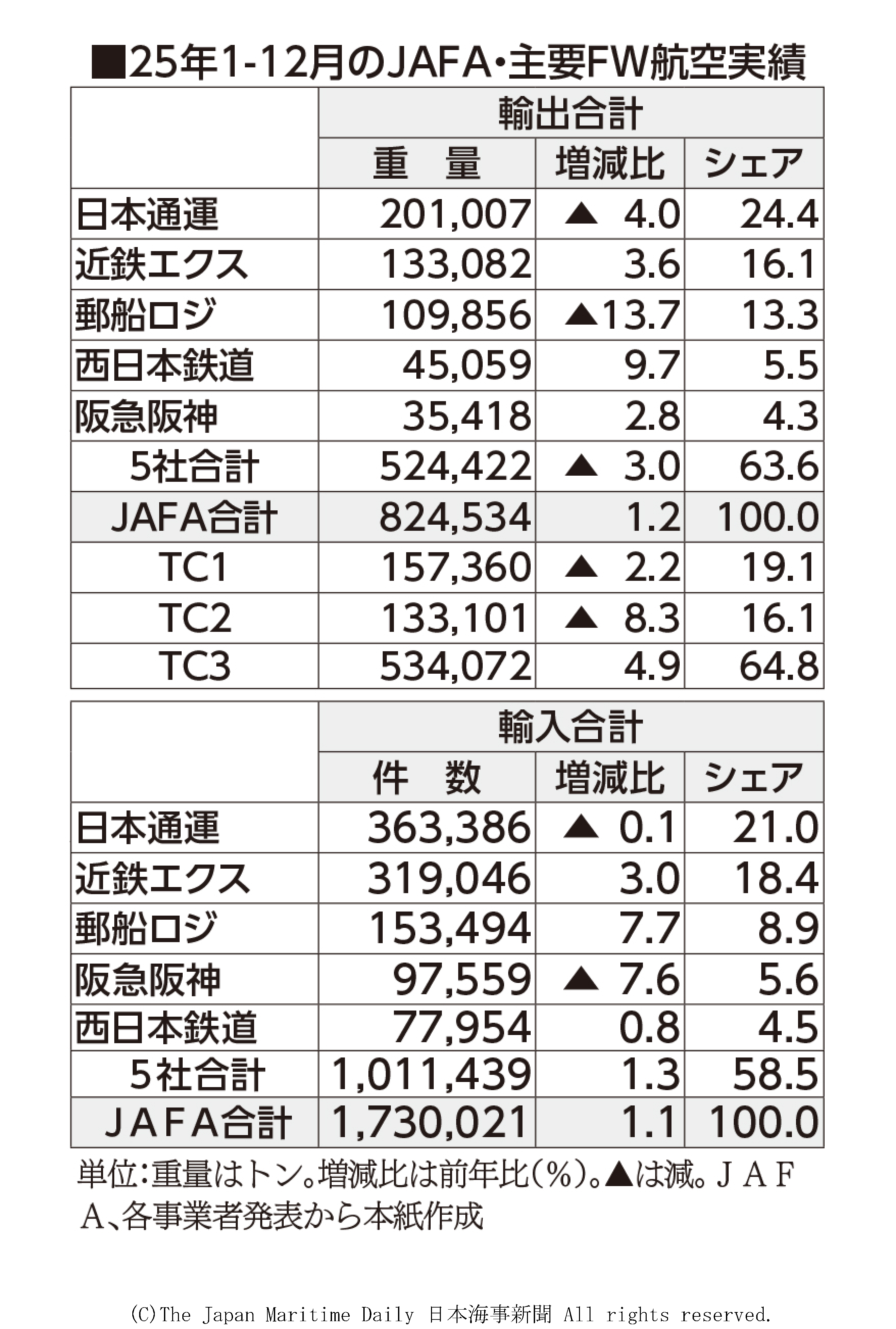 航空貨物運送協会(JAFA)がまとめた2025年(1―12月)の日本発輸出航空混載重量は、前年比1%増の82万4534トンだった。台湾などアジア向けで半導体関連の装置・部品の荷動きが好調だった。欧米
