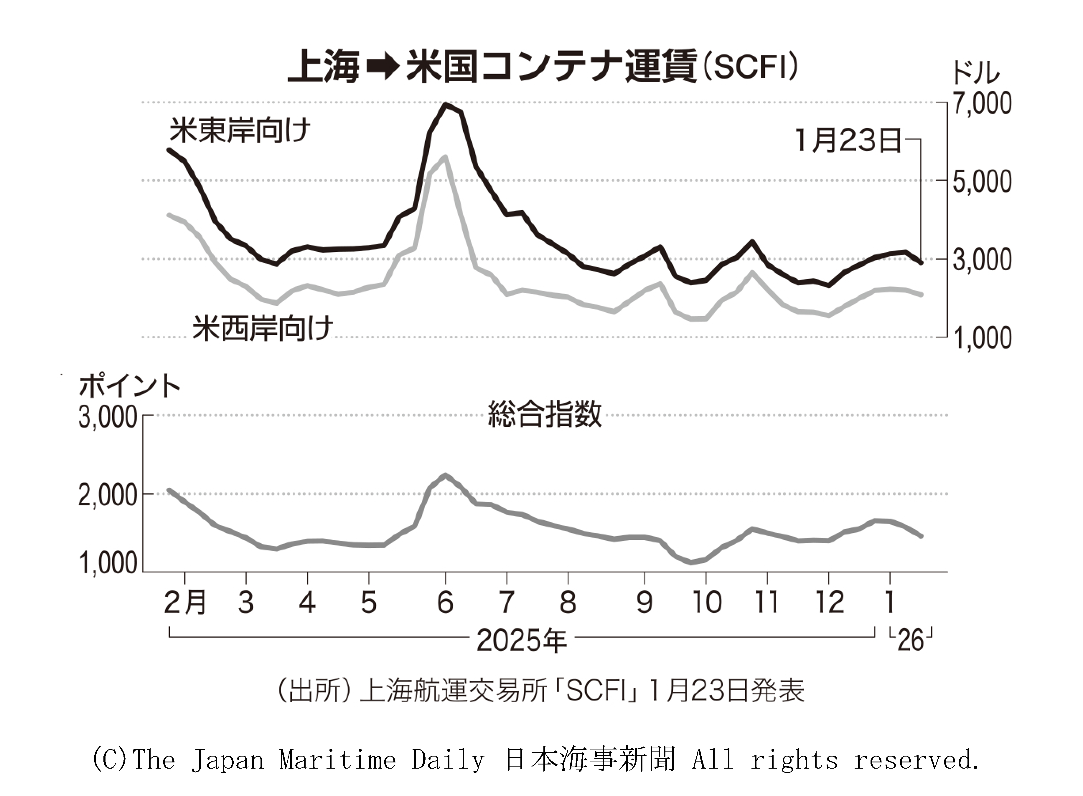 上海航運交易所(SSE)がまとめた1月23日付の上海発コンテナ運賃指数(SCFI)は、欧米向けをはじめ主要航路で軒並み下落した。北米向けは東岸が6週ぶりの下落となったほか、西岸が続落。北欧州向けも続