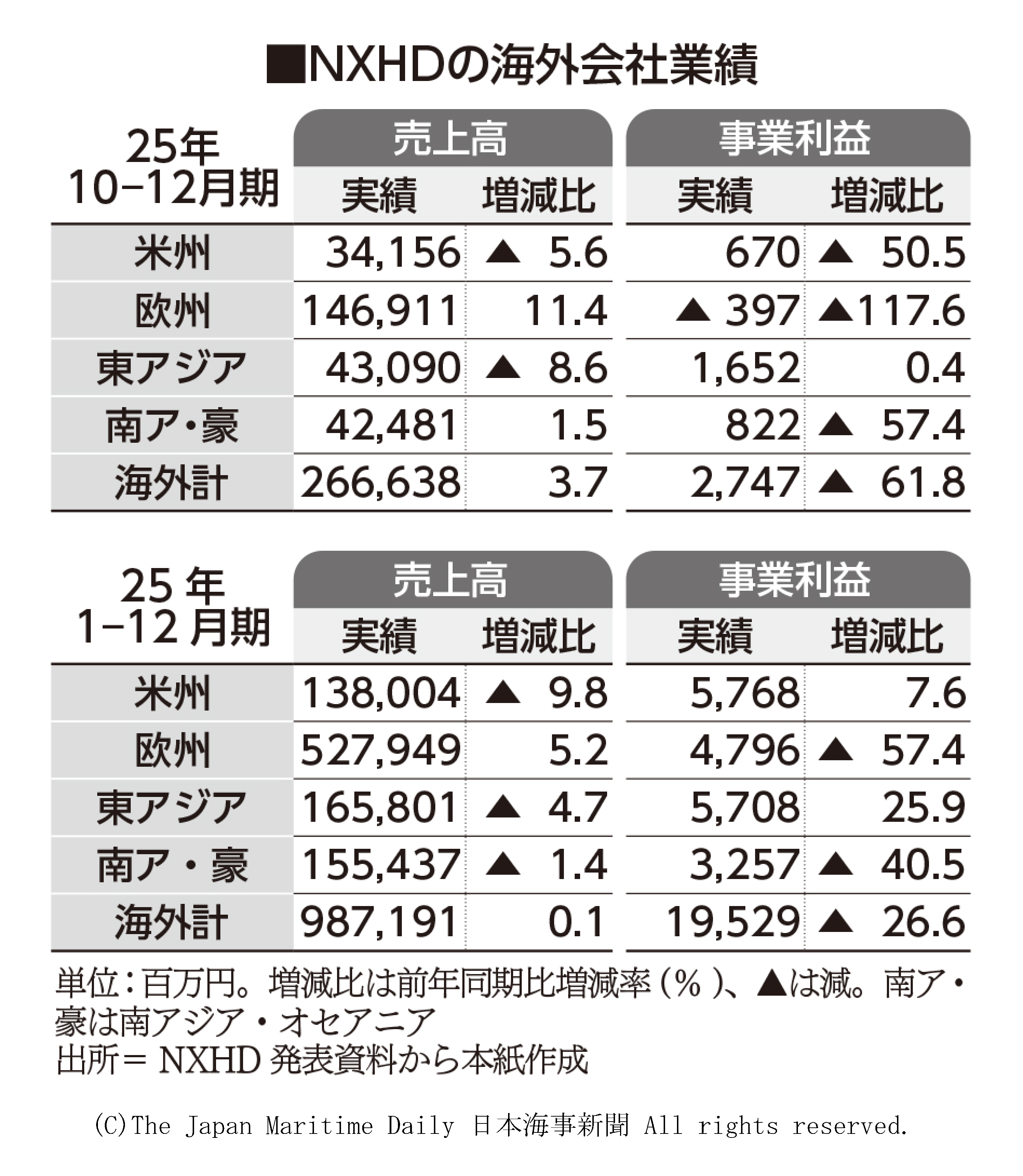 NXHD、海外、年後半に回復。10―12月期、海運が低調
