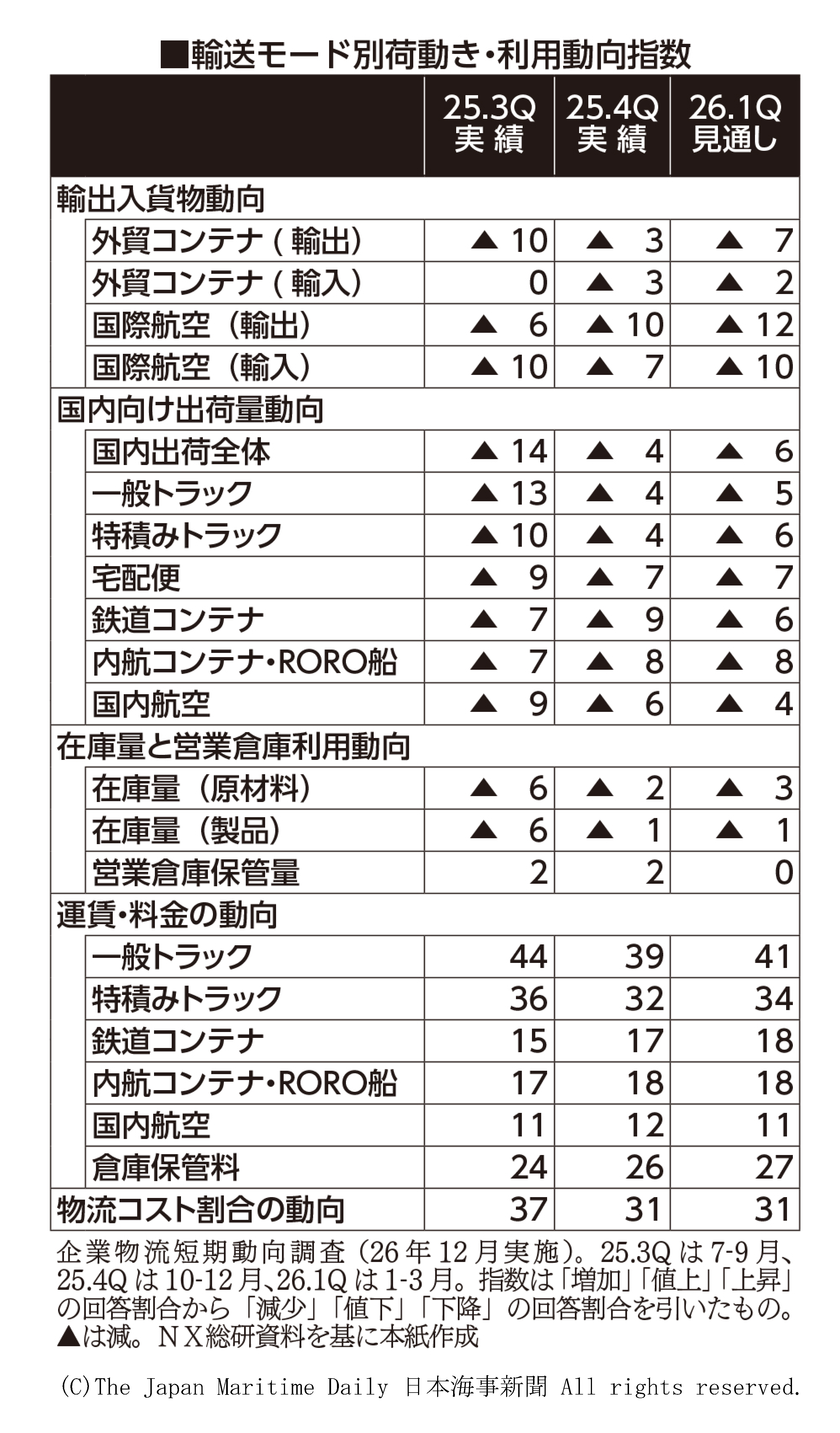 NX総合研究所が2025年12月に実施した「企業物流短期動向調査」(物流短観)によると、26年1―3月の国際貨物の荷動き指数は外貿(海上)コンテナ、国際航空とも輸出で前年同期から荷動きが「悪化する」 ・・・ %E3%80%80NX%E7%B7%8F%E5%90%88%E7%A0%94%E7%A9%B6%E6%89%80%E3%81%8C2025%E5%B9%B412%E6%9C%88%E3%81%AB%E5%AE%9F%E6%96%BD%E3%81%97%E3%81%9F%E3%80%8C%E4%BC%81%E6%A5%AD%E7%89%A9%E6%B5%81%E7%9F%AD%E6%9C%9F%E5%8B%95%E5%90%91%E8%AA%BF%E6%9F%BB%E3%80%8D%28%E7%89%A9%E6%B5%81%E7%9F%AD%E8%A6%B3%29%E3%81%AB%E3%82%88%E3%82%8B%E3%81%A8%E3%80%8126%E5%B9%B41%E2%80%953%E6%9C%88%E3%81%AE%E5%9B%BD%E9%9A%9B%E8%B2%A8%E7%89%A9%E3%81%AE%E8%8D%B7%E5%8B%95%E3%81%8D%E6%8C%87%E6%95%B0%E3%81%AF%E5%A4%96%E8%B2%BF%28%E6%B5%B7%E4%B8%8A%29%3Cdiv+class%3D%27kiji_relation%27%3E%3Cb%3E%E3%82%B3%3C%2Fb%3E%3Cb%3E%E3%83%B3%3C%2Fb%3E%3Cb%3E%E3%83%86%3C%2Fb%3E%3Cb%3E%E3%83%8A%3C%2Fb%3E%3Cdiv+class%3Drel_link%3E%3Ca+href%3D%27%2Fstatic%2Fja%2Fcontainer%2FcontainerNational.html%27+target%3D%27_blank%27%3E%E5%9B%BD%E5%86%85%E6%B8%AF%E3%81%AE%E5%A4%96%E8%B3%87%E3%82%B3%E3%83%B3%E3%83%86%E3%83%8A%E5%8F%96%E6%89%B1%E9%87%8F%3C%2Fa%3E%3C%2Fdiv%3E%3C%2Fdiv%3E%E3%80%81%E5%9B%BD%E9%9A%9B%E8%88%AA%E7%A9%BA%E3%81%A8%E3%82%82%E8%BC%B8%E5%87%BA%E3%81%A7%E5%89%8D%E5%B9%B4%E5%90%8C%E6%9C%9F%E3%81%8B%E3%82%89%E8%8D%B7%E5%8B%95%E3%81%8D%E3%81%8C%E3%80%8C%E6%82%AA%E5%8C%96%E3%81%99%E3%82%8B%E3%80%8D%E3%81%A8%E3%81%AE%E5%A3%B0%E3%81%8C%E3%80%81%E3%80%8C%E6%94%B9%E5%96%84%E3%81%99%E3%82%8B%E3%80%8D%E3%82%92%E4%B8%8A%E5%9B%9E%E3%81%A3%E3%81%9F%E3%80%82%E8%88%AA%E7%A9%BA%E8%BC%B8%E5%85%A5%E3%82%8225%E5%B9%B410%E2%80%9512%E6%9C%88%E3%81%8B%E3%82%89%E6%82%AA%E5%8C%96%E3%82%92%E8%A6%8B%E9%80%9A%E3%81%99%E3%80%82%E6%B5%B7%E4%B8%8A%E8%BC%B8%E5%85%A5%E3%81%AF%E8%8B%A5%E5%B9%B2%E3%81%AE%E6%94%B9%E5%96%84%E3%82%92%E8%A6%8B%E8%BE%BC%E3%82%80%E3%80%82%3Cbr%3E%E3%80%801%E2%80%953%E6%9C%88%E3%81%AE%E8%8D%B7%E5%8B%95%E3%81%8D%E6%8C%87%E6%95%B0%E3%81%AE%E8%A6%8B%E9%80%9A%E3%81%97%E3%82%92%E8%A6%8B%E3%82%8B%E3%81%A8%E3%80%81%E5%A4%96%E8%B2%BF%E3%82%B3%E3%83%B3%E3%83%86%E3%83%8A%E8%BC%B8%E5%87%BA%E3%81%AF%E3%83%9E%E3%82%A4%E3%83%8A%E3%82%B97%E3%81%AB%E6%82%AA%E5%8C%96%E3%80%82%E6%8C%87%E6%95%B0%E3%81%AE%E6%B0%B4%E6%BA%96%E3%81%AF%E3%80%8C%E9%87%91%E5%B1%9E%E8%A3%BD%E5%93%81%E3%80%8D%E3%81%AA%E3%81%A97%E6%A5%AD%E7%A8%AE%E3%81%8C%E3%83%9E%E3%82%A4%E3%83%8A%E3%82%B9%E3%80%81%E3%80%8C%E9%A3%9F%E6%96%99%E5%93%81%E3%83%BB%E9%A3%B2%E6%96%99%E3%80%8D%E3%81%AA%E3%81%A94%E6%A5%AD%E7%A8%AE%E3%81%8C%E3%82%BC%E3%83%AD%E6%B0%B4%E6%BA%96%E3%80%81%E3%80%8C%E4%B8%80%E8%88%AC%E6%A9%9F%E6%A2%B0%E3%80%8D%E3%81%AA%E3%81%A94%E6%A5%AD%E7%A8%AE%E3%81%8C%E3%83%97%E3%83%A9%E3%82%B9%E3%80%82%E3%80%8C%E7%B9%8A%E7%B6%AD%E3%83%BB%E8%A1%A3%E6%9C%8D%E3%80%8D%E3%81%AA%E3%81%A98%E6%A5%AD%E7%A8%AE%E3%81%8C10%E2%80%9512%E6%9C%88%E3%81%8B%E3%82%89%E4%BD%8E%E4%B8%8B%E3%81%99%E3%82%8B%E3%80%82%E6%96%B9%E9%9D%A2%E5%88%A5%E3%81%A7%E3%81%AF%E3%80%81%E3%82%A2%E3%82%B8%E3%82%A2%E3%83%BB%E5%8C%97%E7%B1%B3%E3%83%BB%E6%AC%A7%E5%B7%9E%E3%81%AE%E4%B8%BB%E8%A6%81%E5%85%A8%E6%96%B9%E9%9D%A2%E3%81%8C%E5%BC%95%E3%81%8D%E7%B6%9A%E3%81%8D%E3%83%9E%E3%82%A4%E3%83%8A%E3%82%B9%E3%80%8210%E2%80%9512%E6%9C%88%E3%81%8B%E3%82%89%E3%81%84%E3%81%9A%E3%82%8C%E3%82%82%E4%BD%8E%E4%B8%8B%E3%81%99%E3%82%8B%E3%80%82%3Cbr%3E%E3%80%80%E5%A4%96%E8%B2%BF%E3%82%B3%E3%83%B3%E3%83%86%E3%83%8A%E8%BC%B8%E5%85%A5%E3%81%AF%E3%83%9E%E3%82%A4%E3%83%8A%E3%82%B92%E3%81%A810%E2%80%9512%E6%9C%88%E3%81%8B%E3%82%891%E3%83%9D%E3%82%A4%E3%83%B3%E3%83%88%E6%94%B9%E5%96%84%E3%81%99%E3%82%8B%E3%80%82%E5%85%A8%E6%96%B9%E9%9D%A2%E3%81%8C%E3%83%9E%E3%82%A4%E3%83%8A%E3%82%B9%E3%80%82%E5%8C%97%E7%B1%B3%E3%80%81%E6%AC%A7%E5%B7%9E%E3%81%AF10%E2%80%9512%E6%9C%88%E3%81%8B%E3%82%89%E6%94%B9%E5%96%84%E3%82%82%E3%80%81%E3%82%A2%E3%82%B8%E3%82%A2%E3%81%AF%E4%BD%8E%E4%B8%8B%E3%81%99%E3%82%8B%E3%80%82%3Cbr%3E%E3%80%80%E8%88%AA%E7%A9%BA%E8%BC%B8%E5%87%BA%E3%81%AF%E3%83%9E%E3%82%A4%E3%83%8A%E3%82%B912%E3%81%A810%E2%80%9512%E6%9C%88%E3%81%AE%E3%83%9E%E3%82%A4%E3%83%8A%E3%82%B910%E3%81%8B%E3%82%89%E6%82%AA%E5%8C%96%E3%80%82%E6%8C%87%E6%95%B0%E3%81%AE%E6%B0%B4%E6%BA%96%E3%81%AF%E3%80%81%E3%80%8C%E6%B6%88%E8%B2%BB%E8%B2%A1%E5%8D%B8%E3%80%8D%E3%81%AA%E3%81%A99%E6%A5%AD%E7%A8%AE%E3%81%8C%E3%83%9E%E3%82%A4%E3%83%8A%E3%82%B9%E3%80%81%E3%80%8C%E7%B9%8A%E7%B6%AD%E3%83%BB%E8%A1%A3%E6%9C%8D%E3%80%8D%E3%81%AA%E3%81%A94%E6%A5%AD%E7%A8%AE%E3%81%8C%E3%82%BC%E3%83%AD%E6%B0%B4%E6%BA%96%E3%80%81%E3%80%8C%E9%A3%9F%E6%96%99%E5%93%81%E3%83%BB%E9%A3%B2%E6%96%99%E3%80%8D%E3%81%AA%E3%81%A92%E6%A5%AD%E7%A8%AE%E3%81%8C%E3%83%97%E3%83%A9%E3%82%B9%E3%80%82%E3%80%8C%E5%8C%96%E5%AD%A6%E3%83%BB%E3%83%97%E3%83%A9%E3%82%B9%E3%83%81%E3%83%83%E3%82%AF%E3%80%8D%E3%81%AE%E3%81%BF%E3%80%8110%E2%80%9512%E6%9C%88%E3%81%8B%E3%82%89%E4%B8%8A%E6%98%87%E3%81%99%E3%82%8B%E3%80%82%E6%96%B9%E9%9D%A2%E5%88%A5%E3%81%A7%E3%81%AF%E5%85%A8%E6%96%B9%E9%9D%A2%E3%81%8C%E3%83%9E%E3%82%A4%E3%83%8A%E3%82%B9%E3%81%A7%E3%80%81%E6%AC%A7%E5%B7%9E%E3%81%8C10%E2%80%9512%E6%9C%88%E3%81%8B%E3%82%89%E6%A8%AA%E3%81%B0%E3%81%84%E3%82%82%E5%8C%97%E7%B1%B3%E3%80%81%E3%82%A2%E3%82%B8%E3%82%A2%E3%81%8C%E3%81%A8%E3%82%82%E3%81%AB%E4%BD%8E%E4%B8%8B%E3%81%99%E3%82%8B%E3%80%82%3Cbr%3E%E3%80%80%E8%88%AA%E7%A9%BA%E8%BC%B8%E5%85%A5%E3%81%AF%E3%83%9E%E3%82%A4%E3%83%8A%E3%82%B910%E3%81%A810%E2%80%9512%E6%9C%88%E3%81%AE%E3%83%9E%E3%82%A4%E3%83%8A%E3%82%B97%E3%81%8B%E3%82%89%E6%82%AA%E5%8C%96%E3%81%99%E3%82%8B%E3%80%82%E6%96%B9%E9%9D%A2%E5%88%A5%E3%81%A7%E3%81%AF%E8%88%AA%E7%A9%BA%E8%BC%B8%E5%87%BA%E5%90%8C%E6%A7%98%E3%80%81%E5%85%A8%E6%96%B9%E9%9D%A2%E3%81%8C%E3%83%9E%E3%82%A4%E3%83%8A%E3%82%B9%E3%80%82%E6%AC%A7%E5%B7%9E%E3%81%8C10%E2%80%9512%E6%9C%88%E3%81%8B%E3%82%89%E6%A8%AA%E3%81%B0%E3%81%84%E3%82%82%E5%8C%97%E7%B1%B3%E3%80%81%E3%82%A2%E3%82%B8%E3%82%A2%E3%81%8C%E3%81%A8%E3%82%82%E3%81%AB%E4%BD%8E%E4%B8%8B%E3%81%99%E3%82%8B%E3%80%82%3Cbr%3E%E3%80%80%E2%96%A0%E5%9B%BD%E5%86%85%E5%87%BA%E8%8D%B7%E3%82%82%E6%82%AA%E5%8C%96%3Cbr%3E%E3%80%801%E2%80%953%E6%9C%88%E3%81%AE%E5%9B%BD%E5%86%85%E