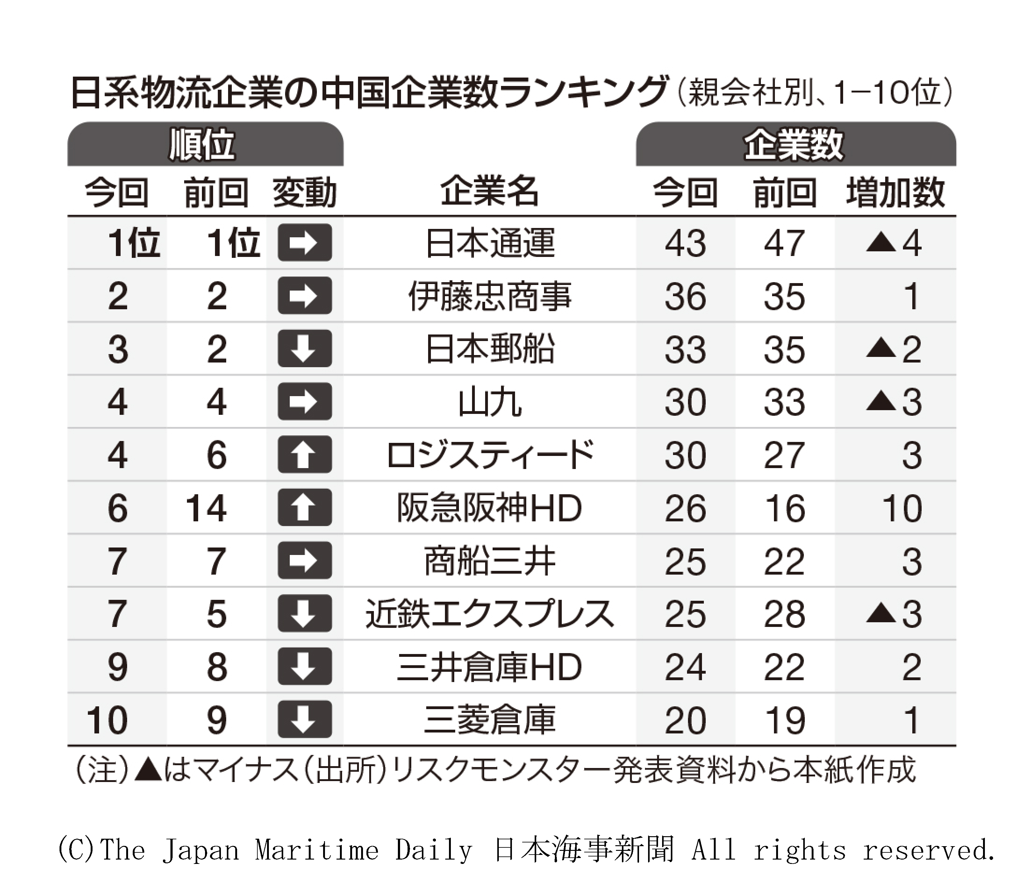中国進出日系物流業、日通が最多。増加数首位は阪急阪神HD