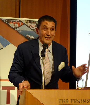 モナコのドライバルク運航大手Cトランスポートマリタイム(CTM)は24日夕、東京都内のホテルで日本の海事関係者を集めた懇親パーティーを開催した。冒頭のあいさつでジョン・マイケル・ラジウィル会長は、日