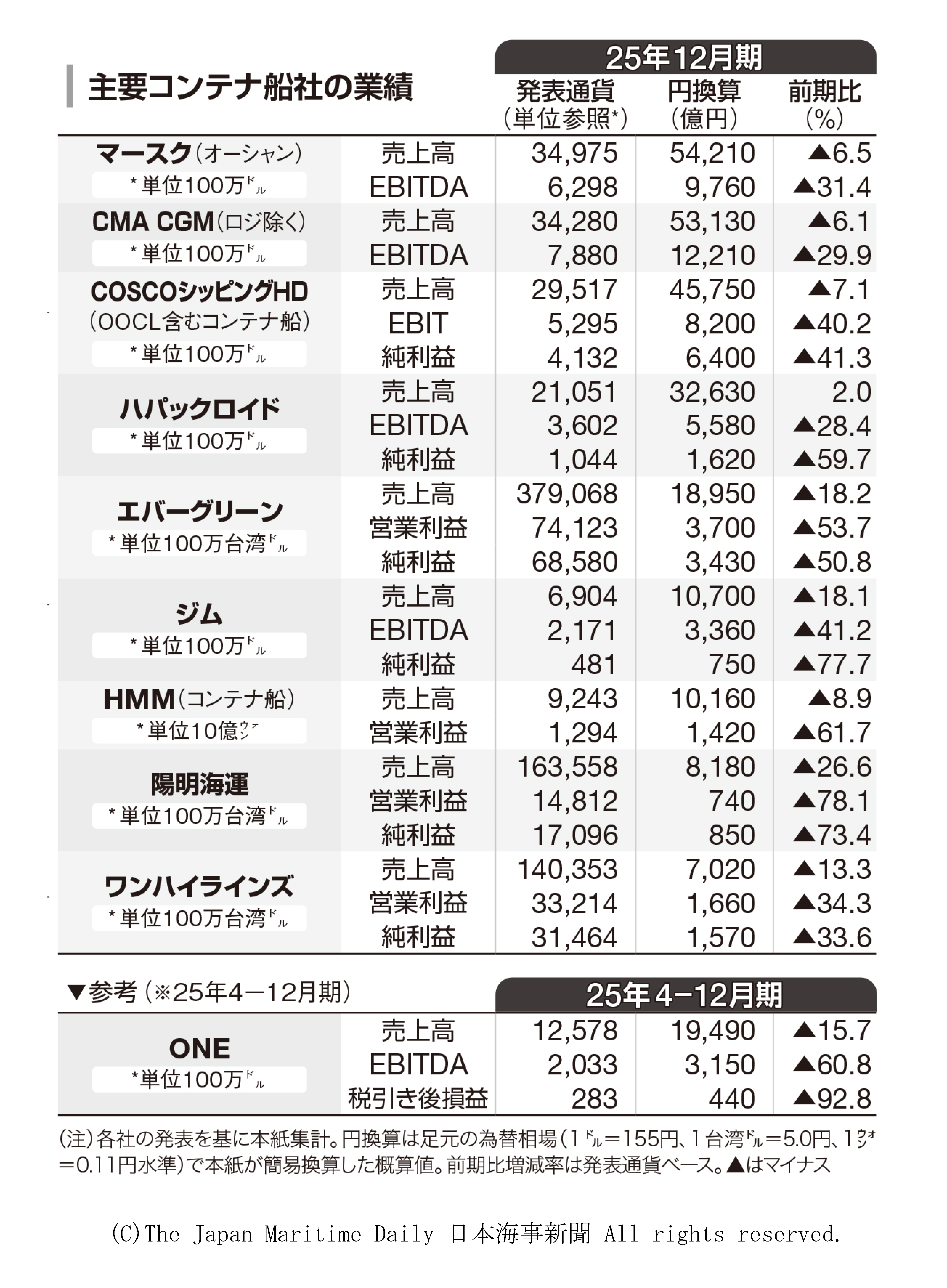 %E3%80%80%E4%B8%BB%E8%A6%81%3Cb%3E%3Cdiv+class%3D%27kiji_relation%27%3E%3Cb%3E%E3%82%B3%3C%2Fb%3E%3Cb%3E%E3%83%B3%3C%2Fb%3E%3Cb%3E%E3%83%86%3C%2Fb%3E%3Cb%3E%E3%83%8A%3C%2Fb%3E%3Cb%3E%E8%88%B9%3C%2Fb%3E%3Cdiv+class%3Drel_link%3E%3Ca+href%3D%27%2Fstatic%2Fja%2Fcontainer%2FcontainerNational.html%27+target%3D%27_blank%27%3E%E5%9B%BD%E5%86%85%E6%B8%AF%E3%81%AE%E5%A4%96%E8%B3%87%E3%82%B3%E3%83%B3%E3%83%86%E3%83%8A%E5%8F%96%E6%89%B1%E9%87%8F%3C%2Fa%3E%3Ca+href%3D%27%2Fdrewrym%2F%3Fgcat%3D2%27+target%3D%27_blank%27%3EDrewry+Monthly%EF%BC%88%E3%82%B3%E3%83%B3%E3%83%86%E3%83%8A%E8%88%B9%EF%BC%89%3C%2Fa%3E%3C%2Fdiv%3E%3C%2Fdiv%3E%E7%A4%BE%3C%2Fb%3E%E3%81%AE2025%E5%B9%B412%E6%9C%88%E6%9C%9F%E9%80%9A%E6%9C%9F%E6%A5%AD%E7%B8%BE%E3%81%AF%E3%80%81%E8%8D%B7%E5%8B%95%E3%81%8D%E3%81%8C%E5%BA%95%E5%A0%85%E3%81%8F%E6%8E%A8%E7%A7%BB%E3%81%97%E3%81%9F%E4%B8%80%E6%96%B9%E3%81%A7%E3%80%81%E4%B8%BB%E8%A6%81%E8%88%B9%E7%A4%BE%E3%81%8C%E5%85%A8%E3%81%A62%E6%A1%81%E6%B8%9B%E7%9B%8A%E3%81%A8%E3%81%AA%E3%81%A3%E3%81%9F%E3%80%82%E5%89%8D%E5%B9%B4%E3%81%AF%E7%B4%85%E6%B5%B7%E6%83%85%E5%8B%A2%E3%81%AE%E6%B7%B7%E4%B9%B1%E3%81%AB%E4%BC%B4%E3%81%86%E9%9C%80%E7%B5%A6%E9%80%BC%E8%BF%AB%28%E3%81%B2%E3%81%A3%E3%81%B1%E3%81%8F%29%E3%81%A7%E9%AB%98%E5%8F%8E%E7%9B%8A%E3%82%92%E7%A2%BA%E4%BF%9D%E3%81%97%E3%81%9F%E3%81%8C%E3%80%8125%E5%B9%B4%E3%81%AF%3Cdiv+class%3D%27kiji_relation%27%3E%3Cb%3E%E6%96%B0%3C%2Fb%3E%3Cb%3E%E9%80%A0%3C%2Fb%3E%3Cdiv+class%3Drel_link%3E%3Ca+href%3D%27%2Fnewsec%2F%27+target%3D%27_blank%27%3E%E6%96%B0%E9%80%A0%E3%83%BB%E4%B8%AD%E5%8F%A4%E8%88%B9Fixture%E6%83%85%E5%A0%B1%3C%2Fa%3E%3C%2Fdiv%3E%3C%2Fdiv%3E%E8%88%B9%E3%81%AE%E6%B5%81%E5%85%A5%E3%81%AB%E3%82%88%E3%82%8B%E4%BE%9B%E7%B5%A6%E5%9C%A7%E5%8A%9B%E3%82%84%E7%B1%B3%E3%83%88%E3%83%A9%E3%83%B3%E3%83%97%E6%94%BF%E6%A8%A9%E3%81%AB%E3%82%88%E3%82%8B%E9%96%A2%E7%A8%8E%E6%94%BF%E7%AD%96%E3%82%92%E8%83%8C%E6%99%AF%E3%81%A8%E3%81%97%E3%81%9F%E8%8D%B7%E9%87%8F%E3%81%AE%E5%B9%B3%E6%BA%96%E5%8C%96%E3%81%AA%E3%81%A9%E3%81%A7%E3%80%81%E9%81%8B%E8%B3%83%E6%B0%B4%E6%BA%96%E3%81%8C%E4%BD%8E%E4%B8%8B%E3%80%82%E6%95%B0%E9%87%8F%E5%A2%97%E3%81%A7%E3%81%AF%E5%9F%8B%E3%82%81%E5%88%87%E3%82%8C%E3%81%AA%E3%81%84%E3%81%BB%E3%81%A9%E3%80%81%E9%81%8B%E8%B3%83%E4%B8%8B%E8%90%BD%E3%81%AE%E5%BD%B1%E9%9F%BF%E3%81%8C%E5%A4%A7%E3%81%8D%E3%81%8B%E3%81%A3%E3%81%9F%E3%80%82%E3%81%95%E3%82%89%E3%81%AB%E8%B6%B3%E5%85%83%E3%81%A7%E3%81%AF%E4%B8%AD%E6%9D%B1%E6%83%85%E5%8B%A2%E3%81%AE%E7%B7%8A%E8%BF%AB%E3%81%8C%E5%86%8D%E3%81%B3%E3%82%B3%E3%82%B9%E3%83%88%E3%81%A8%E3%83%8D%E3%83%83%E3%83%88%E3%83%AF%E3%83%BC%E3%82%AF%E9%81%8B%E5%96%B6%E3%81%AE%E9%87%8D%E8%8D%B7%E3%81%A8%E3%81%AA%E3%82%8A%E5%A7%8B%E3%82%81%E3%81%A6%E3%81%8A%E3%82%8A%E3%80%81%E5%90%84%E7%A4%BE%E3%81%AF26%E5%B9%B4%E3%81%AE%E4%BA%8B%E6%A5%AD%E7%92%B0%E5%A2%83%E3%82%92%E6%85%8E%E9%87%8D%E3%81%AB%E3%81%BF%E3%81%A6%E3%81%84%E3%82%8B%E3%80%82%3Cbr%3E%3Cbr%3E%E3%80%80%E3%82%B3%E3%83%B3%E3%83%86%E3%83%8A%E8%88%B9%E4%BA%8B%E6%A5%AD%E3%81%AE%E8%A6%8F%E6%A8%A1%E3%81%8C%E5%A4%A7%E3%81%8D%E3%81%84%E4%B8%BB%E8%A6%819%E7%A4%BE%E3%81%AE25%E5%B9%B412%E6%9C%88%E6%9C%9F%E6%A5%AD%E7%B8%BE%E3%81%AF%E8%A1%A8%E3%81%AE%E9%80%9A%E3%82%8A%E3%80%82%E8%88%B9%E8%85%B9%E8%A6%8F%E6%A8%A1%E3%81%A7%E9%A6%96%E4%BD%8D%E3%81%AE%E3%82%B9%E3%82%A4%E3%82%B9%E8%88%B9%E7%A4%BEMSC%E3%81%AF%E6%B1%BA%E7%AE%97%E6%95%B0%E5%80%A4%E3%82%92%E9%96%8B%E7%A4%BA%E3%81%97%E3%81%AA%E3%81%84%E3%80%82%E5%8F%82%E8%80%83%E3%81%AB%E3%82%AA%E3%83%BC%E3%82%B7%E3%83%A3%E3%83%B3%E3%83%8D%E3%83%83%E3%83%88%E3%83%AF%E3%83%BC%E3%82%AF%E3%82%A8%E3%82%AF%E3%82%B9%E3%83%97%E3%83%AC%E3%82%B9%28ONE%29%E3%81%AE25%E5%B9%B44%E2%80%9512%E6%9C%88%E6%9C%9F%E6%A5%AD%E7%B8%BE%E3%82%92%E4%BB%98%E3%81%91%E3%81%9F%E3%81%8C%E3%80%81%E6%B1%BA%E7%AE%97%E6%9C%9F%E3%81%8C%E7%95%B0%E3%81%AA%E3%82%8B%E3%81%9F%E3%82%81%E5%8D%98%E7%B4%94%E6%AF%94%E8%BC%83%E3%81%A7%E3%81%8D%E3%81%AA%E3%81%84%E3%80%82%3Cbr%3E%E3%80%8025%E5%B9%B4%E3%81%AE%E8%8D%B7%E5%8B%95%E3%81%8D%E3%81%9D%E3%81%AE%E3%82%82%E3%81%AE%E3%81%AF%E5%A0%85%E8%AA%BF%E3%81%AB%E6%8E%A8%E7%A7%BB%E3%81%99%E3%82%8B%E4%B8%80%E6%96%B9%E3%80%81%E9%81%8B%E8%B3%83%E5%B8%82%E6%B3%81%E3%81%8C%E5%A5%BD%E8%AA%BF%E3%81%A0%E3%81%A3%E3%81%9F%E5%89%8D%E5%B9%B4%E3%81%8B%E3%82%89%E3%81%AF%E7%B4%94%E5%88%A9%E7%9B%8A%E3%81%8C5%E5%89%B2%E8%B6%85%E3%81%AE%E6%B8%9B%E7%9B%8A%E3%81%A8%E3%81%AA%E3%81%A3%E3%81%9F%E4%BC%9A%E7%A4%BE%E3%81%8C%E5%A4%9A%E3%81%8B%E3%81%A3%E3%81%9F%E3%80%82%E3%81%9F%E3%81%A0%E3%80%8124%E5%B9%B4%E3%81%AE%E5%88%A9%E7%9B%8A%E6%B0%B4%E6%BA%96%E3%81%8C%E9%AB%98%E3%81%8B%E3%81%A3%E3%81%9F%E3%81%93%E3%81%A8%E3%81%8B%E3%82%89%E3%80%81%E8%87%AA%E7%A4%BE%E3%81%AE25%E5%B9%B4%E6%A5%AD%E7%B8%BE%E3%82%92%E5%81%A5%E9%97%98%E3%81%97%E3%81%9F%E3%81%A8%E8%A9%95%E4%BE%A1%E3%81%97%E3%81%9F%E4%BC%9A%E7%A4%BE%E3%81%8C%E5%A4%9A%E3%81%84%E3%80%82%3Cbr%3E%E3%80%80%E9%81%8B%E8%B3%83%E6%B0%B4%E6%BA%96%E3%81%AE%E4%BD%8E%E4%B8%8B%E3%81%AB%E4%BC%B4%E3%81%84%E3%80%81%E5%A2%97%E5%8F%8E%E3%82%92%E7%A2%BA%E4%BF%9D%E3%81%A7%E3%81%8D%E3%81%9F%E3%81%AE%E3%81%AF%E3%83%8F%E3%83%91%E3%83%83%E3%82%AF%E3%83%AD%E3%82%A4%E3%83%89%E3%81%AE%E3%81%BF%E3%81%A0%E3%81%A3%E3%81%9F%E3%81%8C%E3%80%81%3Cdiv+class%3D%27kiji_relation%27%3E%3Cb%3E%E3%82%B3%3C%2Fb%3E%3Cb%3E%E3%83%B3%3C%2Fb%3E%3Cb%3E%E3%83%86%3C%2Fb%3E%3Cb%3E%E3%83%8A%3C%2Fb%3E%3Cdiv+class%3Drel_link%3E%3Ca+href%3D%27%2Fstatic%2Fja%2Fcontainer%2FcontainerNational.html%27+target%3D%27_blank%27%3E%E5%9B%BD%E5%86%85%E6%B8%AF%E3%81%AE%E5%A4%96%E8%B3%87%E3%82%B3%E3%83%B3%E3%83%86%E3%83%8A%E5%8F%96%E6%89%B1%E9%87%8F%3C%2Fa%3E%3C%2Fdiv%3E%3C%2Fdiv%3E%E5%8F%96%E6%89%B1%E9%87%8F%E3%81%AB%E3%81%A4%E3%81%84%E3%81%A6%E3%81%AF%E5%90%8C%E7%A4%BE%E3%82%84%E3%83%9E%E3%83%BC%E3%82%B9%E3%82%AF%E3%81%AA%E3%81%A9%E8%A4%87%E6%95%B0%E7%A4%BE%E3%81%8C%E5%89%8D%E5%B9%B4%E8%B6%85%E3%81%88%E3%81%A8%E3%81%AA%E3%81%A3%E3%81%9F%E3%81%BB%E3%81%8B%E3%80%81%E6%A8%AA%E3%81%B0%E3%81%84%E3%81%8B%E3%82%89%E5%BE%AE%E6%B8%9B%E3%81%AB%E6%8A%91%E3%81%88%E3%81%9F%E4%BC%9A%E7%A4%BE%E3%81%8C%E5%A4%9A%E3%81%8B%E3%81%A3%E3%81%9F%E3%80%82%E3%83%9E%E3%83%BC%E3%82%B9%E3%82%AF%E3%81%A8%E3%83%8F%E3%83%91%