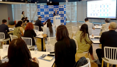 商船三井の特長や成長戦略を英語で現地記者に丁寧に解説した