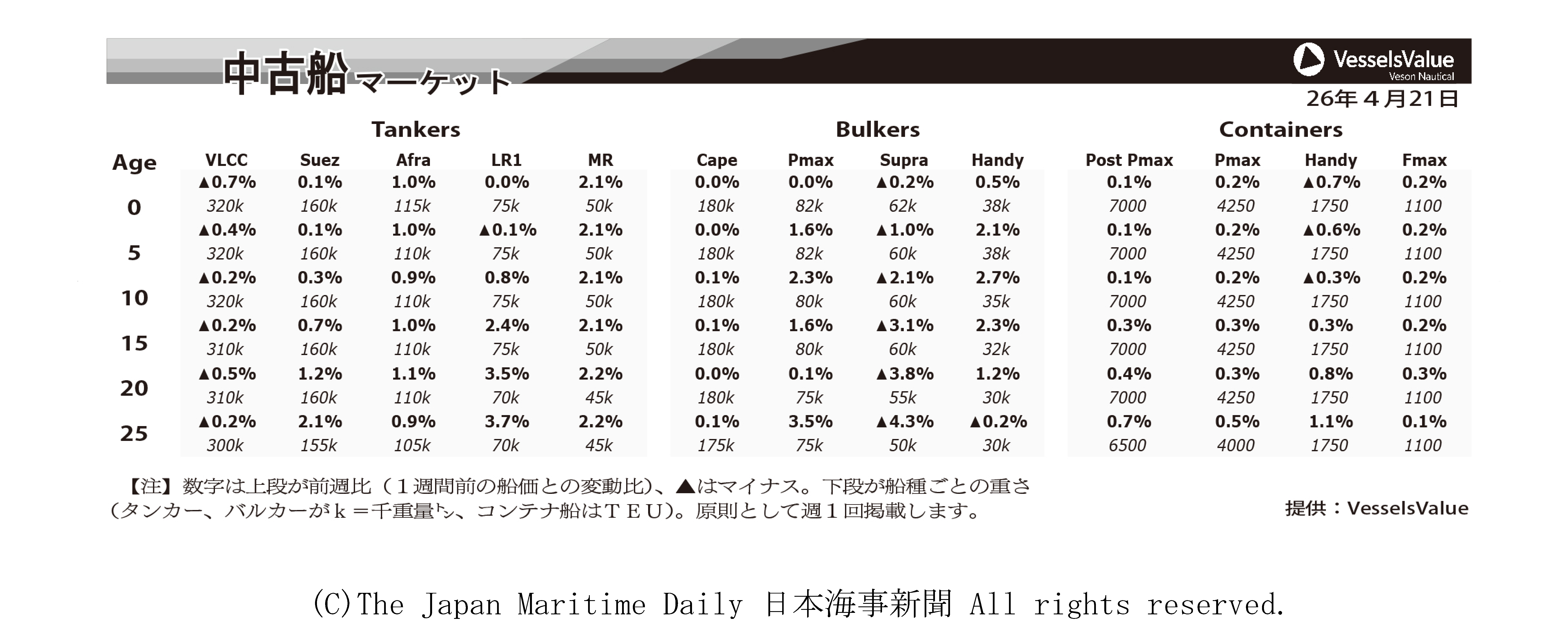%E3%80%80%E2%96%A0%3Cdiv+class%3D%27kiji_relation%27%3E%3Cb%3E%E4%B8%AD%3C%2Fb%3E%3Cb%3E%E5%8F%A4%3C%2Fb%3E%3Cdiv+class%3Drel_link%3E%3Ca+href%3D%27%2Fnewsec%2F%3Fsecflg%3Dsec%27+target%3D%27_blank%27%3E%E6%96%B0%E9%80%A0%E3%83%BB%E4%B8%AD%E5%8F%A4%E8%88%B9Fixture%E6%83%85%E5%A0%B1%EF%BC%88%E4%B8%AD%E5%8F%A4%E8%88%B9%EF%BC%89%3C%2Fa%3E%3C%2Fdiv%3E%3C%2Fdiv%3E%E8%88%B9%E3%83%9E%E3%83%BC%E3%82%B1%E3%83%83%E3%83%88%3Cbr%3E%3Cbr%3E%E3%80%80%E6%B3%A8%29%E6%95%B0%E5%AD%97%E3%81%AF%E4%B8%8A%E6%AE%B5%E3%81%8C%E5%89%8D%E9%80%B1%E6%AF%94%281%E9%80%B1%E9%96%93%E5%89%8D%E3%81%AE%E8%88%B9%E4%BE%A1%E3%81%A8%E3%81%AE%E5%A4%89%E5%8B%95%E6%AF%94%29%E3%80%81%E2%96%B2%E3%81%AF%E3%83%9E%E3%82%A4%E3%83%8A%E3%82%B9%E3%80%82%E4%B8%8B%E6%AE%B5%E3%81%8C%E8%88%B9%E7%A8%AE%E3%81%94%E3%81%A8%E3%81%AE%E9%87%8D%E3%81%95%28%3Cdiv+class%3D%27kiji_relation%27%3E%3Cb%3E%E3%82%BF%3C%2Fb%3E%3Cb%3E%E3%83%B3%3C%2Fb%3E%3Cb%3E%E3%82%AB%3C%2Fb%3E%3Cb%3E%E3%83%BC%3C%2Fb%3E%3Cdiv+class%3Drel_link%3E%3Ca+href%3D%27%2Fdrewryw%2F%3Fdcat%3D3%27+target%3D%27_blank%27%3EDrewry+Weekly%EF%BC%88%E3%82%BF%E3%83%B3%E3%82%AB%E3%83%BC%E7%94%A8%E8%88%B9%E6%83%85%E5%A0%B1%EF%BC%89%3C%2Fa%3E%3Ca+href%3D%27%2Fdrewrym%2F%3Fgcat%3D3%27+target%3D%27_blank%27%3EDrewry+Monthly%EF%BC%88%E3%82%BF%E3%83%B3%E3%82%AB%E3%83%BC%E3%83%BB%E3%83%97%E3%83%AD%E3%83%80%E3%82%AF%E3%83%88%E8%88%B9%EF%BC%89%3C%2Fa%3E%3C%2Fdiv%3E%3C%2Fdiv%3E%E3%80%81%3Cdiv+class%3D%27kiji_relation%27%3E%3Cb%3E%E3%83%90%3C%2Fb%3E%3Cb%3E%E3%83%AB%3C%2Fb%3E%3Cb%3E%E3%82%AB%3C%2Fb%3E%3Cb%3E%E3%83%BC%3C%2Fb%3E%3Cdiv+class%3Drel_link%3E%3Ca+href%3D%27%2Fyosen%2F%27+target%3D%27_blank%27%3E%E7%94%A8%E8%88%B9%E6%83%85%E5%A0%B1%EF%BC%88%E3%83%89%E3%83%A9%E3%82%A4%E3%83%90%E3%83%AB%E3%82%AB%E3%83%BC%EF%BC%89%3C%2Fa%3E%3Ca+href%3D%27%2Fdrewryw%2F%3Fdcat%3D2%27+target%3D%27_blank%27%3EDrewry+Weekly%EF%BC%88%E3%83%89%E3%83%A9%E3%82%A4%E7%94%A8%E8%88%B9%E6%83%85%E5%A0%B1%EF%BC%89%3C%2Fa%3E%3Ca+href%3D%27%2Fdrewrym%2F%27+target%3D%27_blank%27%3EDrewry+Monthly%EF%BC%88%E3%83%90%E3%83%AB%E3%82%AB%E3%83%BC%EF%BC%89%3C%2Fa%3E%3C%2Fdiv%3E%3C%2Fdiv%3E%E3%81%8CK%3D%E5%8D%83%E9%87%8D%E9%87%8F%E3%83%88%E3%83%B3%E3%80%81%3Cdiv+class%3D%27kiji_relation%27%3E%3Cb%3E%E3%82%B3%3C%2Fb%3E%3Cb%3E%E3%83%B3%3C%2Fb%3E%3Cb%3E%E3%83%86%3C%2Fb%3E%3Cb%3E%E3%83%8A%3C%2Fb%3E%3Cb%3E%E8%88%B9%3C%2Fb%3E%3Cdiv+class%3Drel_link%3E%3Ca+href%3D%27%2Fstatic%2Fja%2Fcontainer%2FcontainerNational.html%27+target%3D%27_blank%27%3E%E5%9B%BD%E5%86%85%E6%B8%AF%E3%81%AE%E5%A4%96%E8%B3%87%E3%82%B3%E3%83%B3%E3%83%86%E3%83%8A%E5%8F%96%E6%89%B1%E9%87%8F%3C%2Fa%3E%3Ca+href%3D%27%2Fdrewrym%2F%3Fgcat%3D2%27+target%3D%27_blank%27%3EDrewry+Monthly%EF%BC%88%E3%82%B3%E3%83%B3%E3%83%86%E3%83%8A%E8%88%B9%EF%BC%89%3C%2Fa%3E%3C%2Fdiv%3E%3C%2Fdiv%3E%E3%81%AFTEU%29%E3%80%82%E5%8E%9F%E5%89%87%E3%81%A8%E3%81%97%E3%81%A6%E9%80%B11%E5%9B%9E%E6%8E%B2%E8%BC%89%E3%81%97%E3%81%BE%E3%81%99%E3%80%82%3Cbr%3E%3Cbr%3E%E3%80%80+%E6%8F%90%E4%BE%9B%3AVesselsValue.com%3Cbr%3E